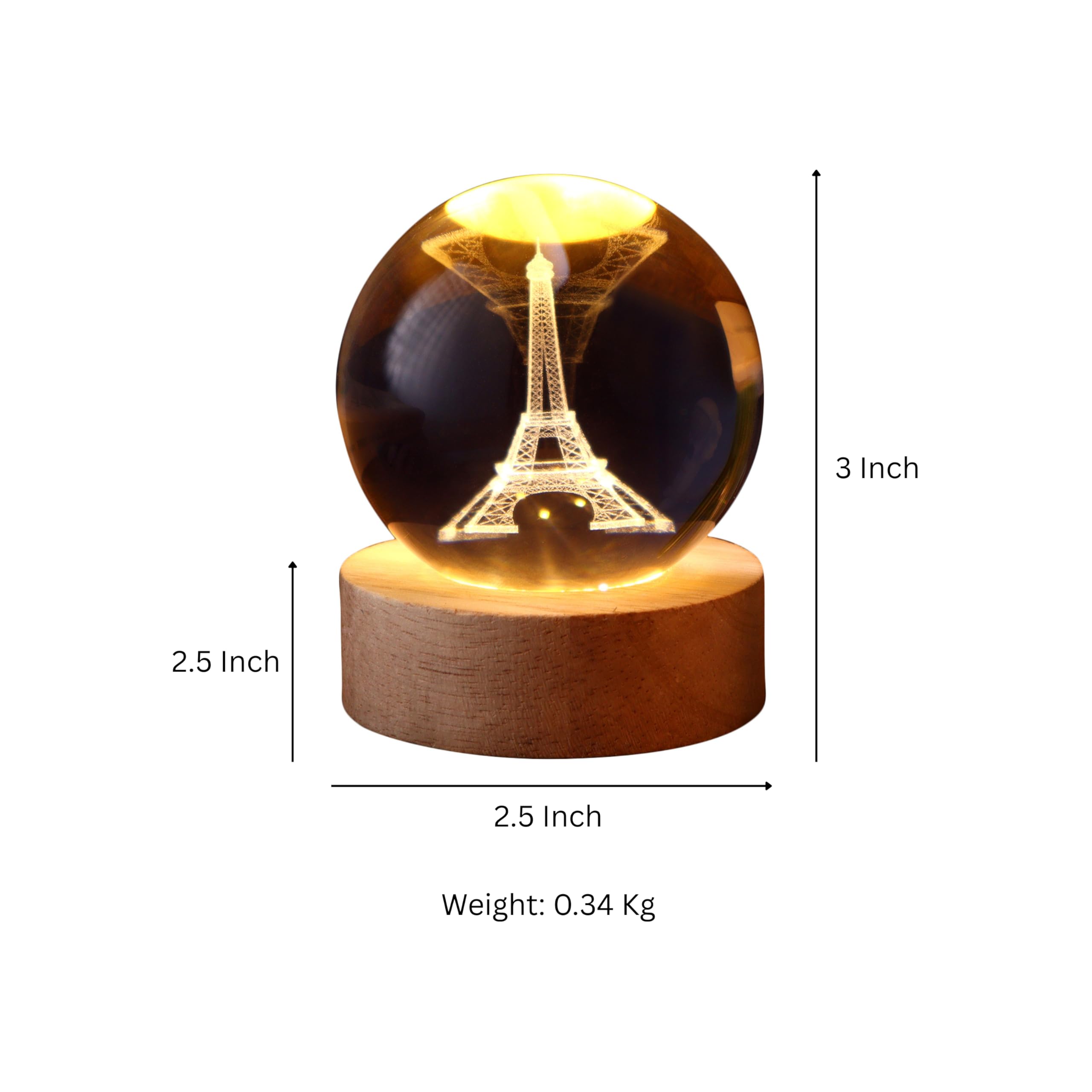 This 3D LED glass ball features a finely crafted Eiffel Tower figurine inside, creating a mesmerizing visual effect when illuminated. Made with high-quality glass and a plug-in LED light, it casts a warm and enchanting glow, perfect for enhancing the ambiance of bedrooms, living rooms, or study areas. Ideal as a decorative centerpiece, table accent, or gift item, this lamp adds elegance and charm wherever it is placed. Its 3D design brings the Eiffel Tower to life, making it a unique piece that combines style, visual appeal, and functionality seamlessly. Perfect for adding a cozy, romantic, or stylish touch to your home decor.