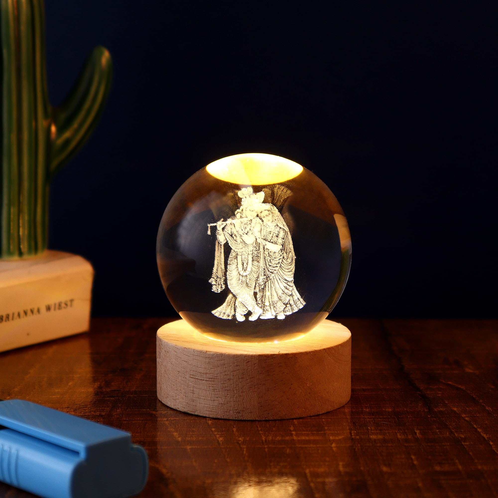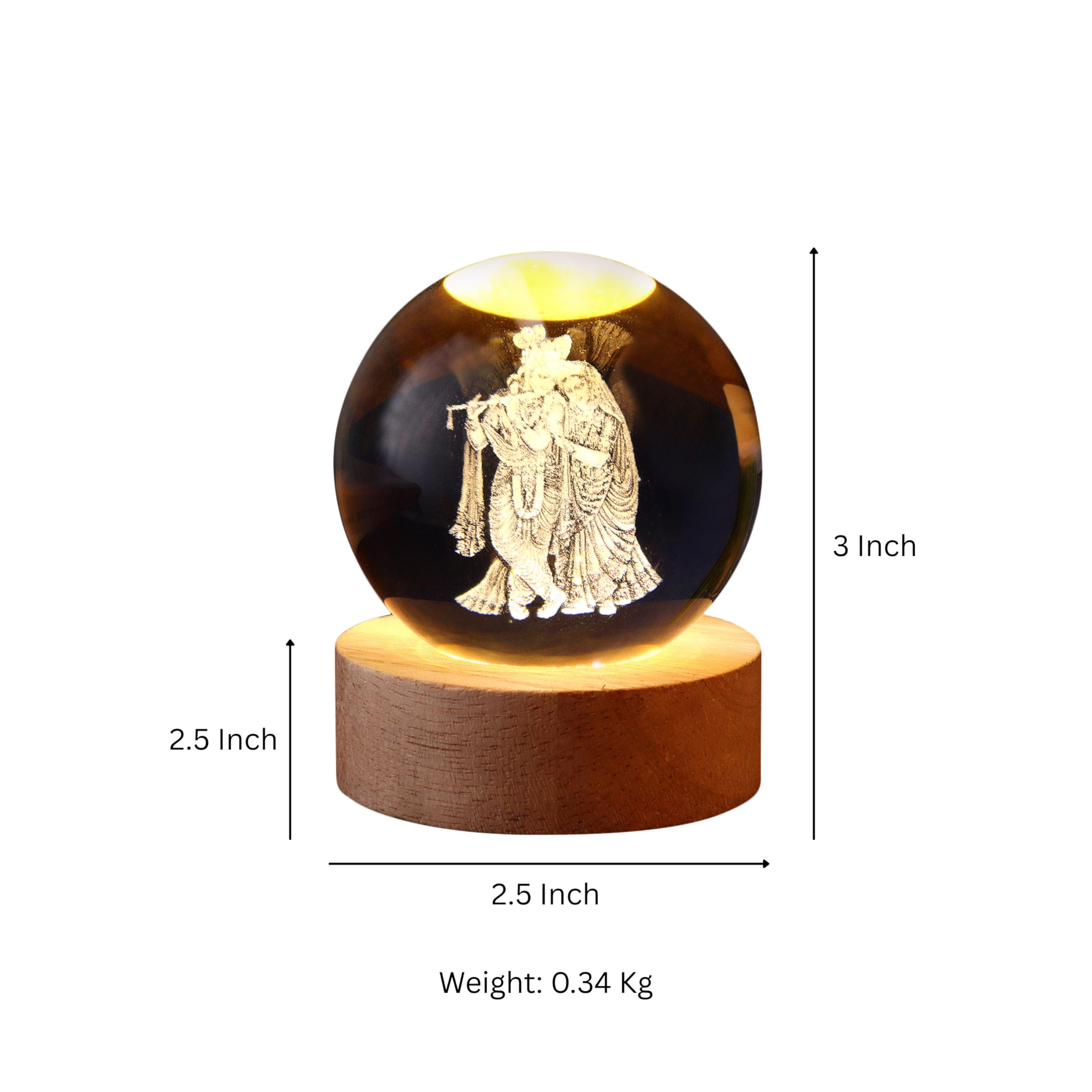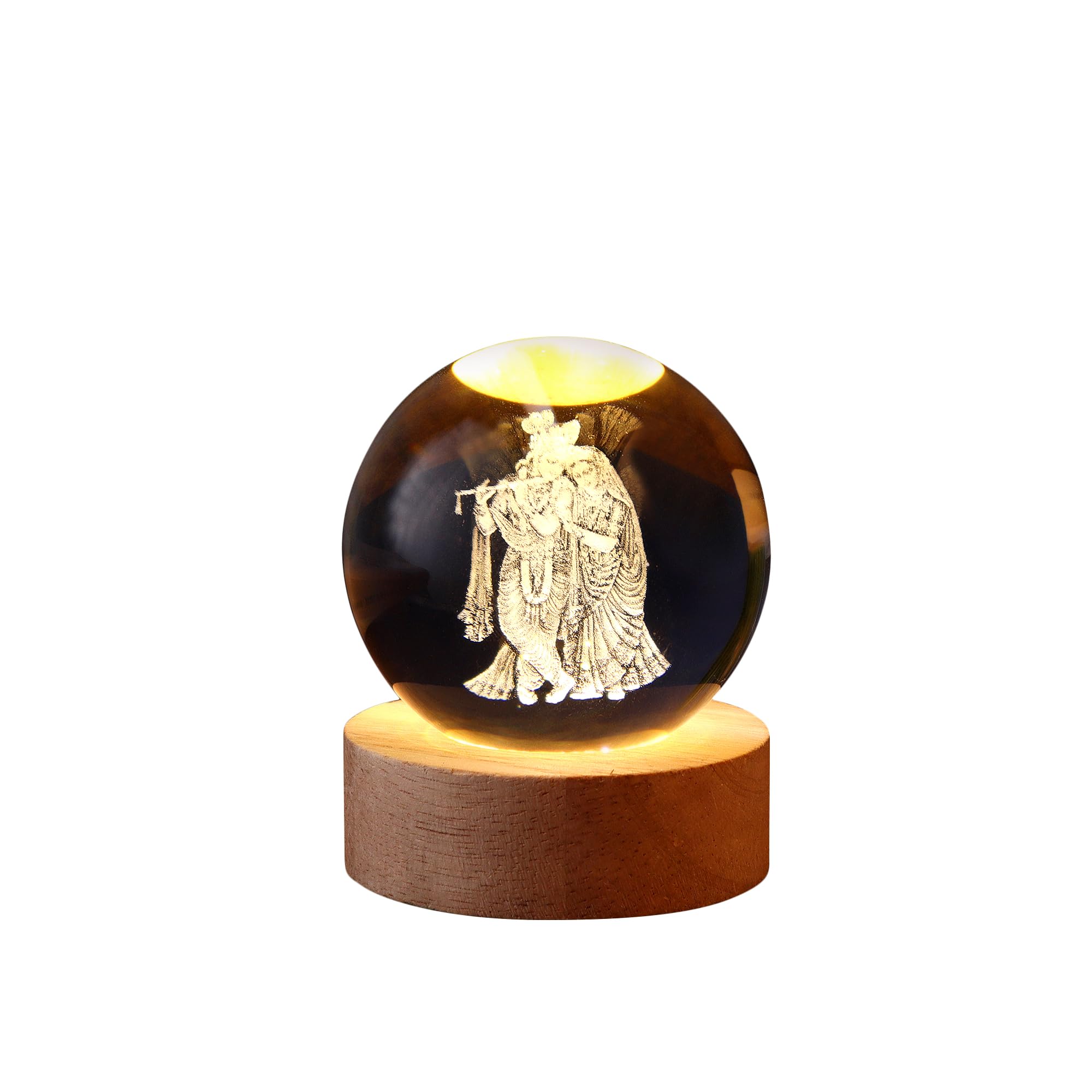 This 3D LED glass ball features a beautifully crafted Radha Krishna figurine inside, creating a captivating visual effect when illuminated. Made with high-quality glass and a plug-in LED light, it casts a warm and divine glow, perfect for enhancing the spiritual ambiance of home interiors, bedrooms, or living rooms. Ideal as a decorative centerpiece, table accent, or gifting item, this lamp adds charm, devotion, and elegance wherever it is placed. Its 3D design brings the Radha Krishna figurine to life, making it a unique piece that combines spirituality, style, and functionality seamlessly. Perfect for adding a sacred and visually striking touch to your home decor.