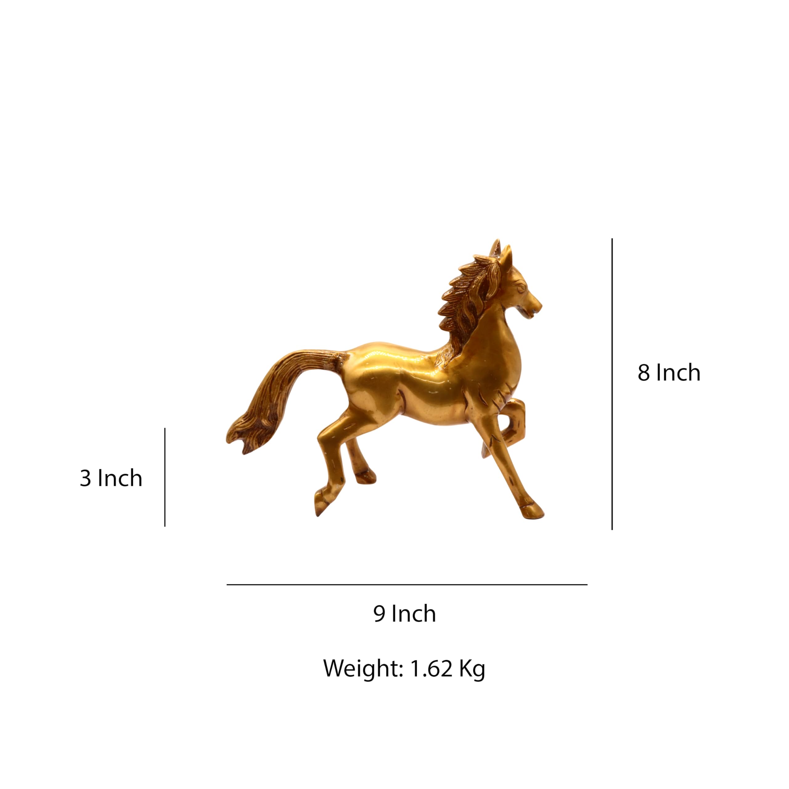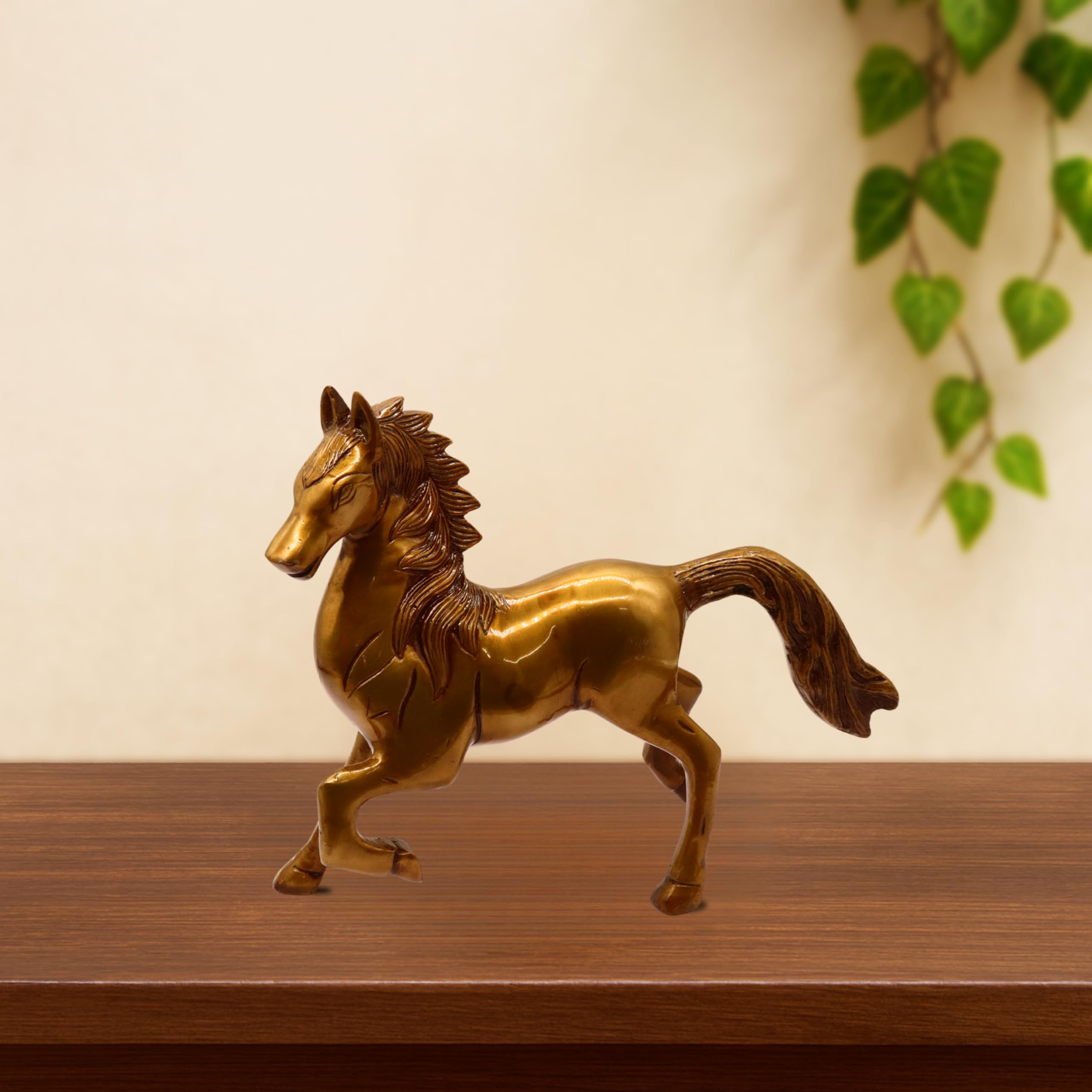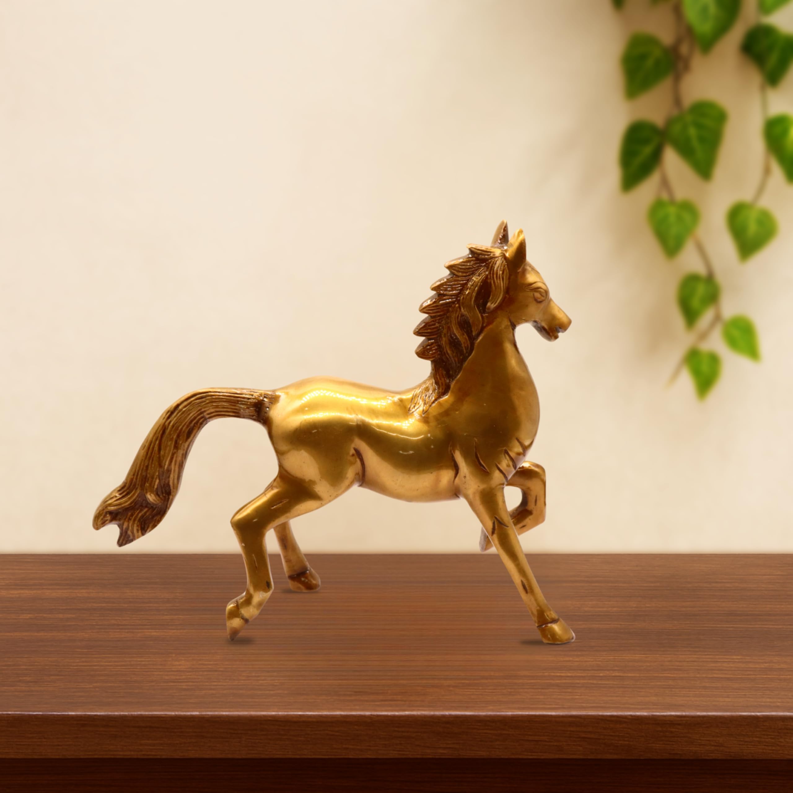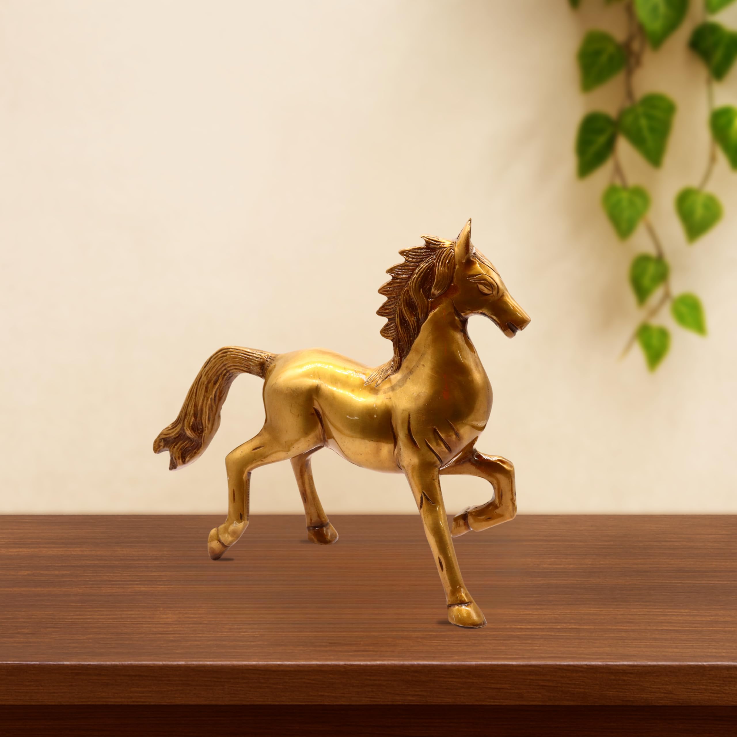 This beautifully crafted Brass Running Horse Showpiece is made from solid heavy brass and features elegant detailing on its mane, tail, and muscular structure, giving it a premium artistic appearance. The running posture symbolizes speed, growth, success, and positive movement, making it ideal for vastu placement, office desk décor, or home interiors. Its glossy golden finish adds sophistication to living rooms, showcases, and decorative corners. Strong, stable, and stylish, this brass horse figurine also makes an impressive gift for housewarmings, inaugurations, and festive celebrations.