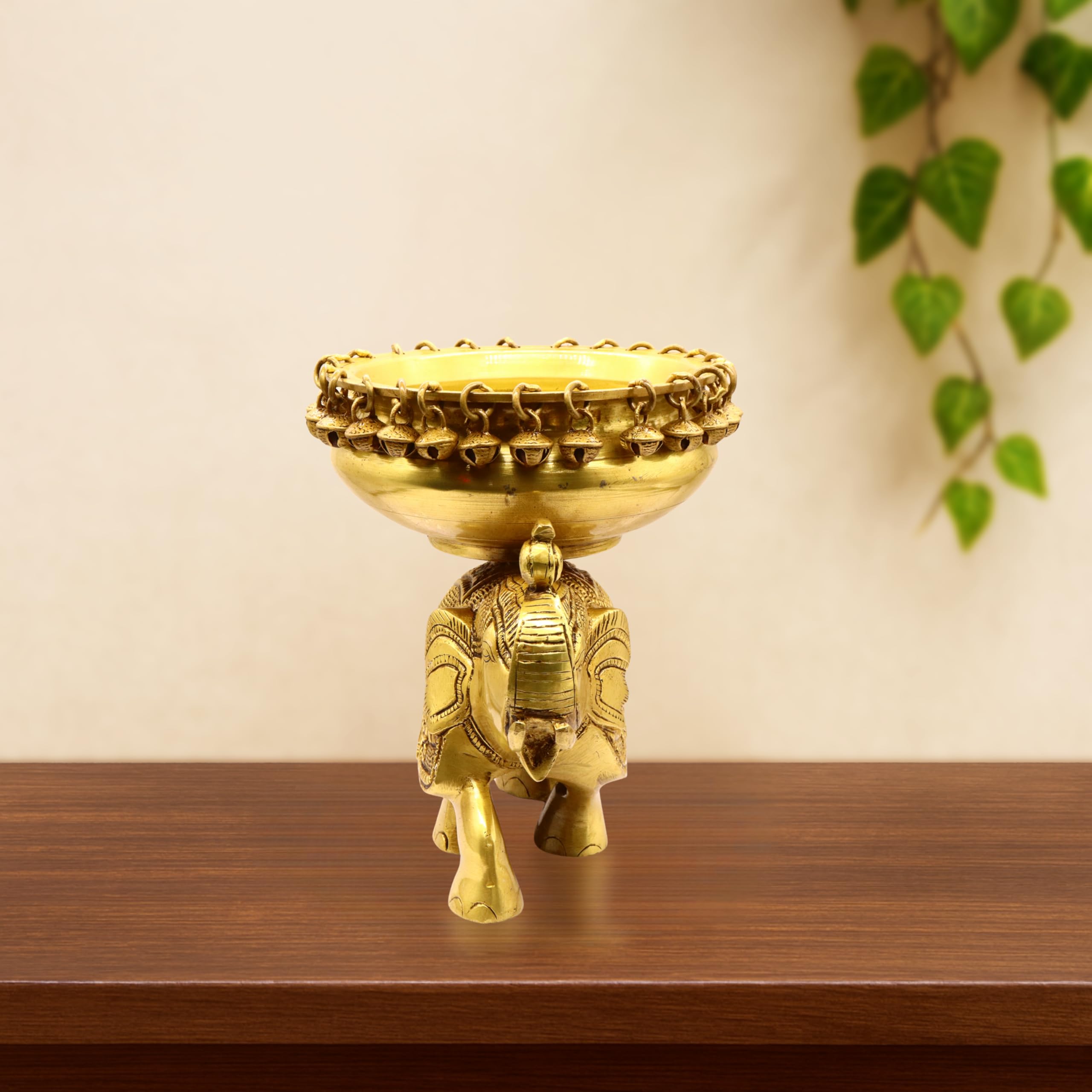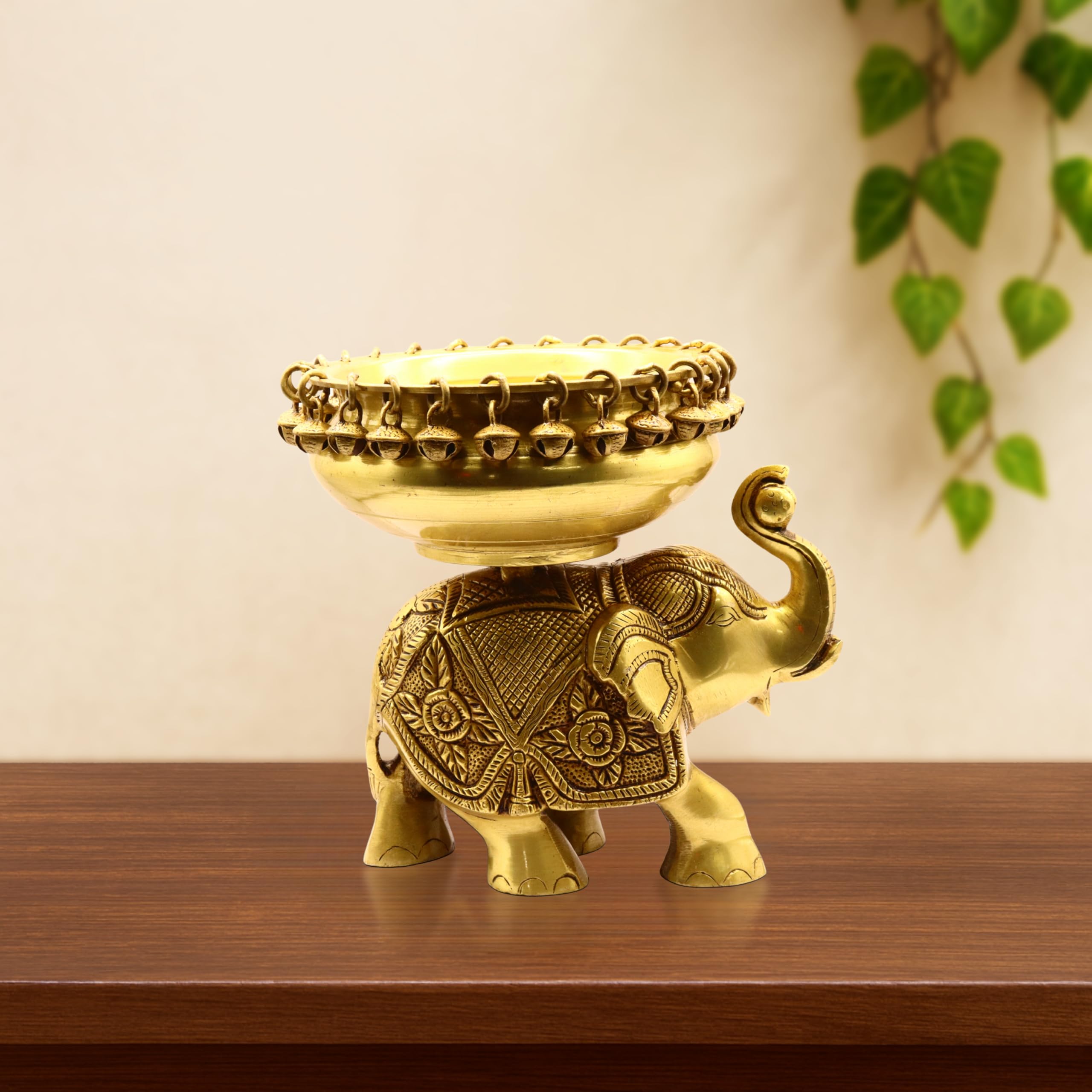 This beautifully crafted Brass Elephant Urli features a solid brass construction with a detailed single elephant base supporting a rounded urli bowl decorated with traditional hanging bells. Its handcrafted detailing and golden finish make it a perfect centrepiece for home entrances, living rooms, mandirs, and festive setups. Ideal for floating candles, water décor, flowers, or fragrant petals, this urli enhances any space with a rich cultural ambience. Durable, elegant, and visually striking, it also makes a meaningful gift for housewarming and festive celebrations.