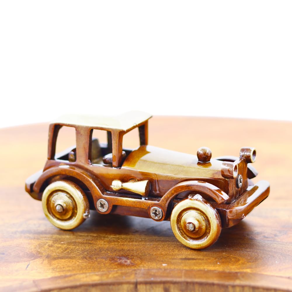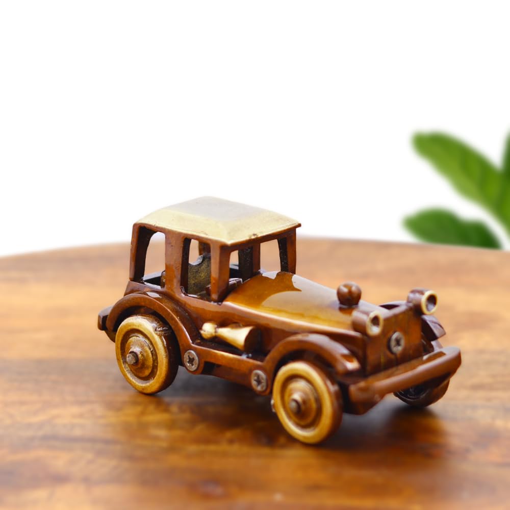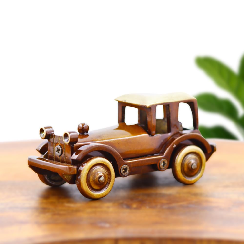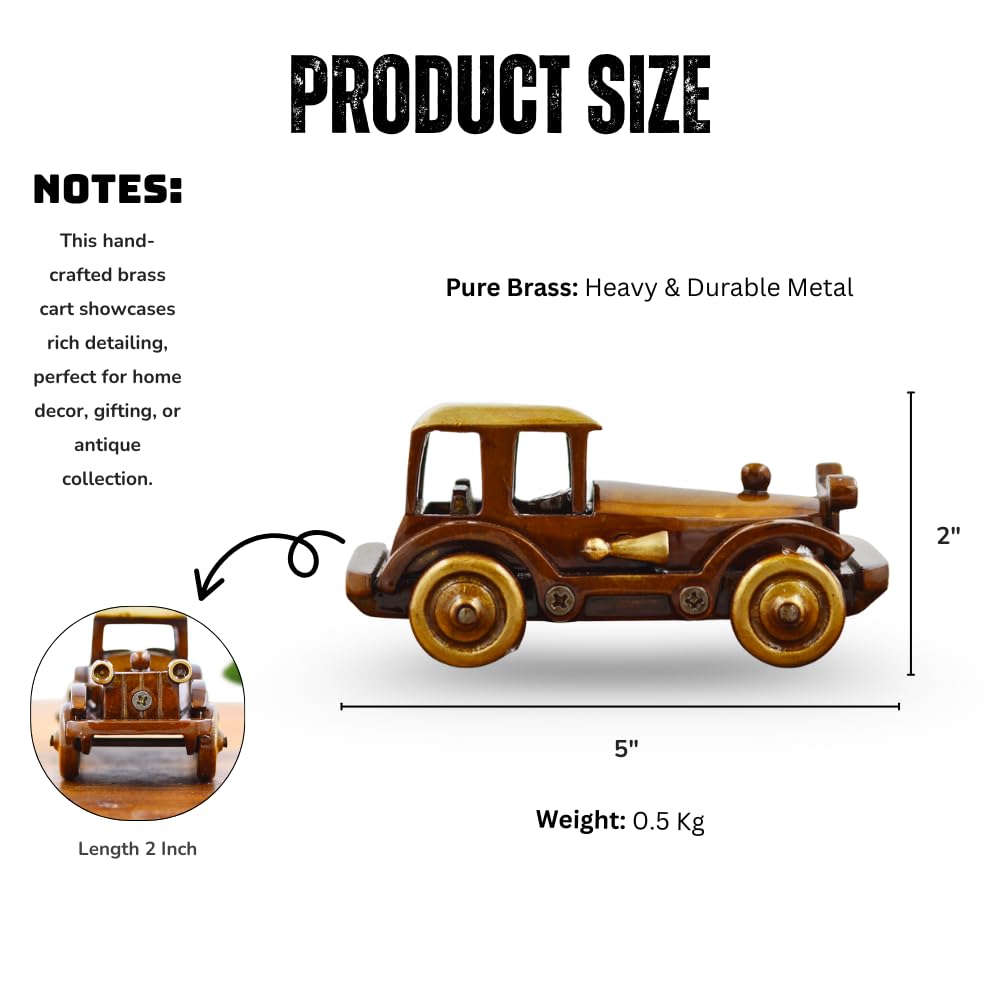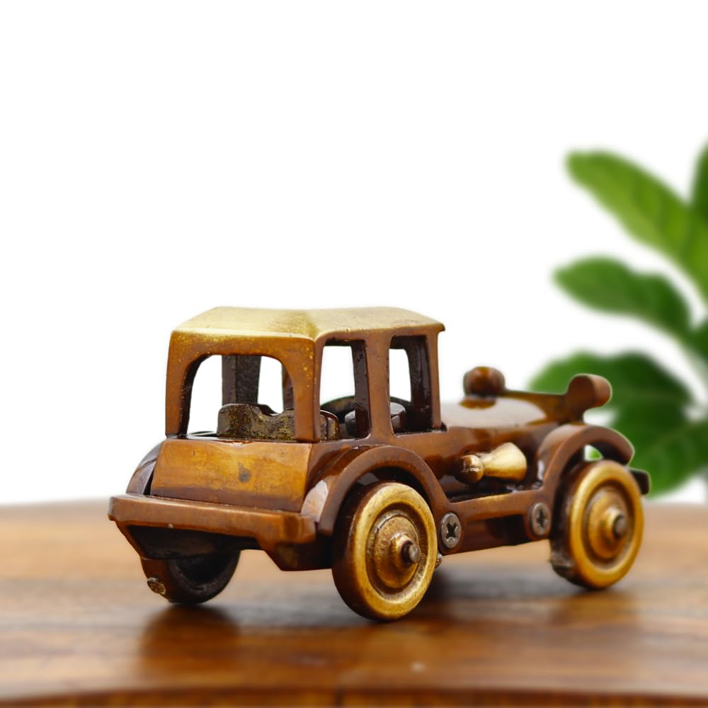 Made from high-quality brass alloy, the car is sturdy, corrosion-resistant, and built to last. It features a two-tone antique polish  a deep brown oxidized body and a golden matte roof. Each component, including the wheels, horn, and frame, is carefully detailed and screwed for a mechanical aesthetic.