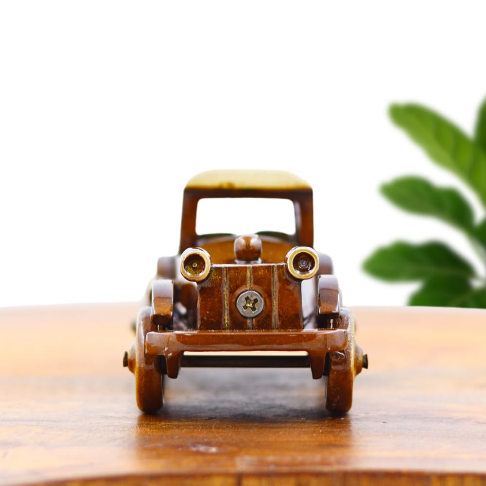 This unique showpiece captures the charm of a retro vintage car, complete with a boxy cabin, golden roof, circular headlights, and detailed wheel rims. The curvy mudguards and bonnet mimic early 20th-century automobile designs. Crafted with elegant proportions, the miniature brings nostalgic flair to any setup.