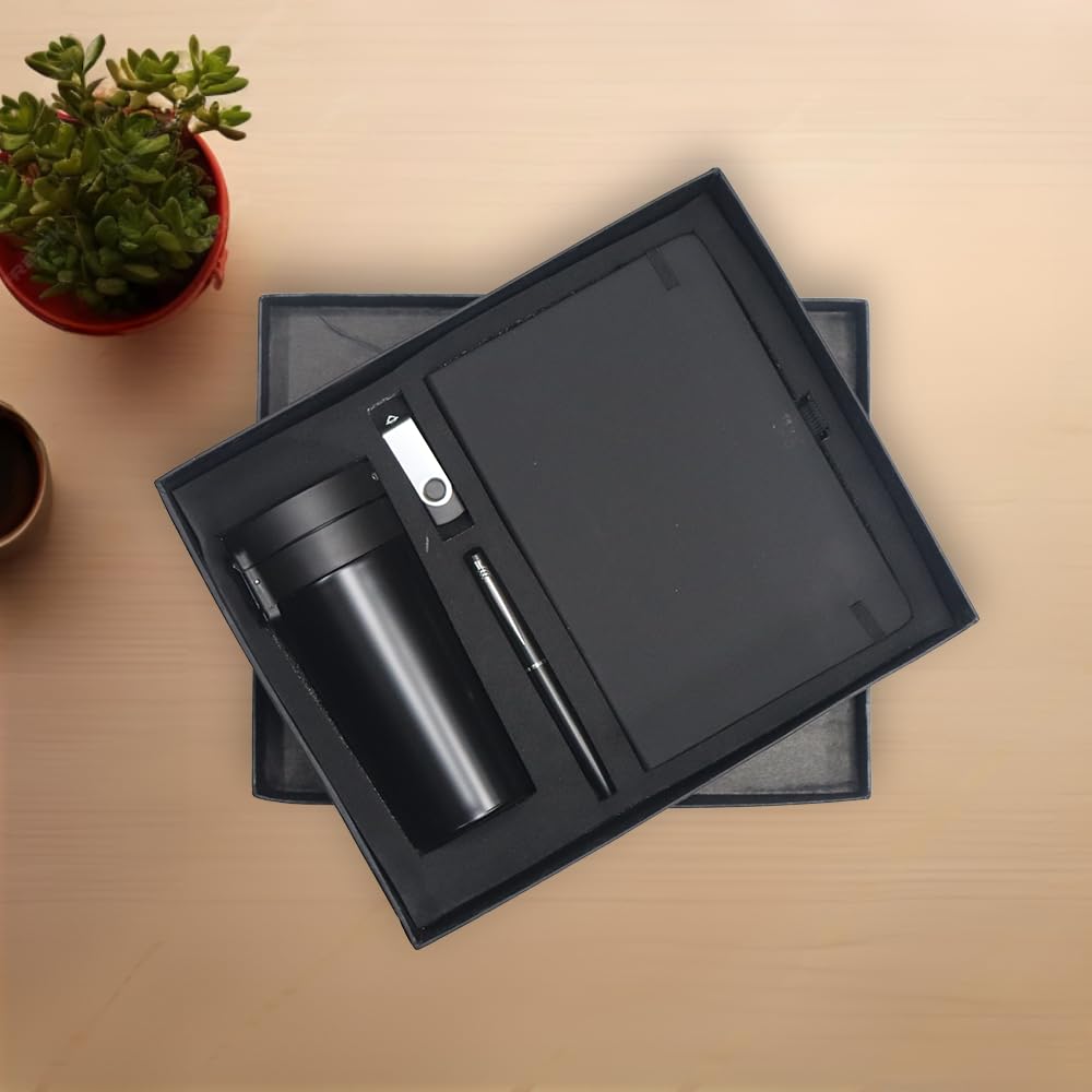 A thoughtfully curated executive gift set featuring an insulated coffee mug to keep beverages hot or cold, a smooth-writing pen, a handy pen drive for data storage, and a premium diary. Perfect for professionals, this set combines practicality, style, and convenience — an ideal token of appreciation for employees, clients, and business partners.