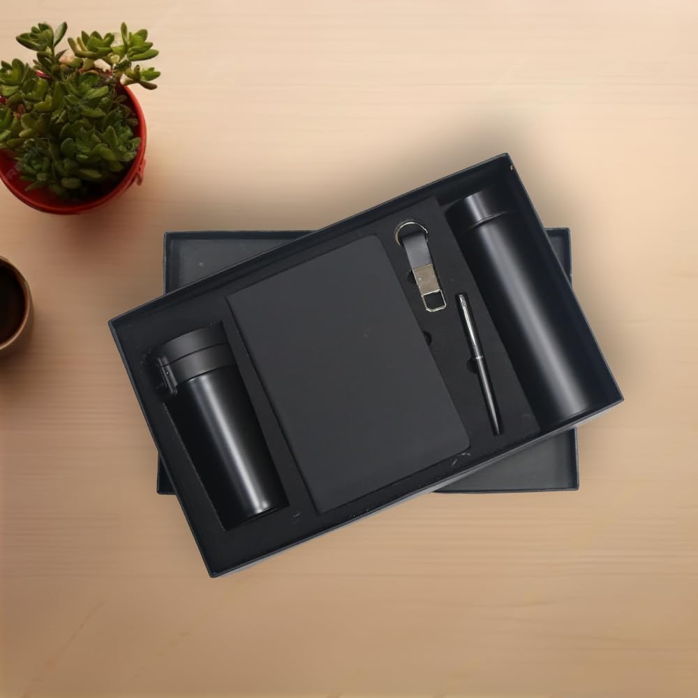 A complete executive gift set featuring a temperature-controlled bottle, insulated coffee mug, handy keychain, smooth-writing pen, and premium diary. Perfect for professionals, this set offers style, convenience, and functionality — an ideal way to appreciate employees, clients, and business partners.