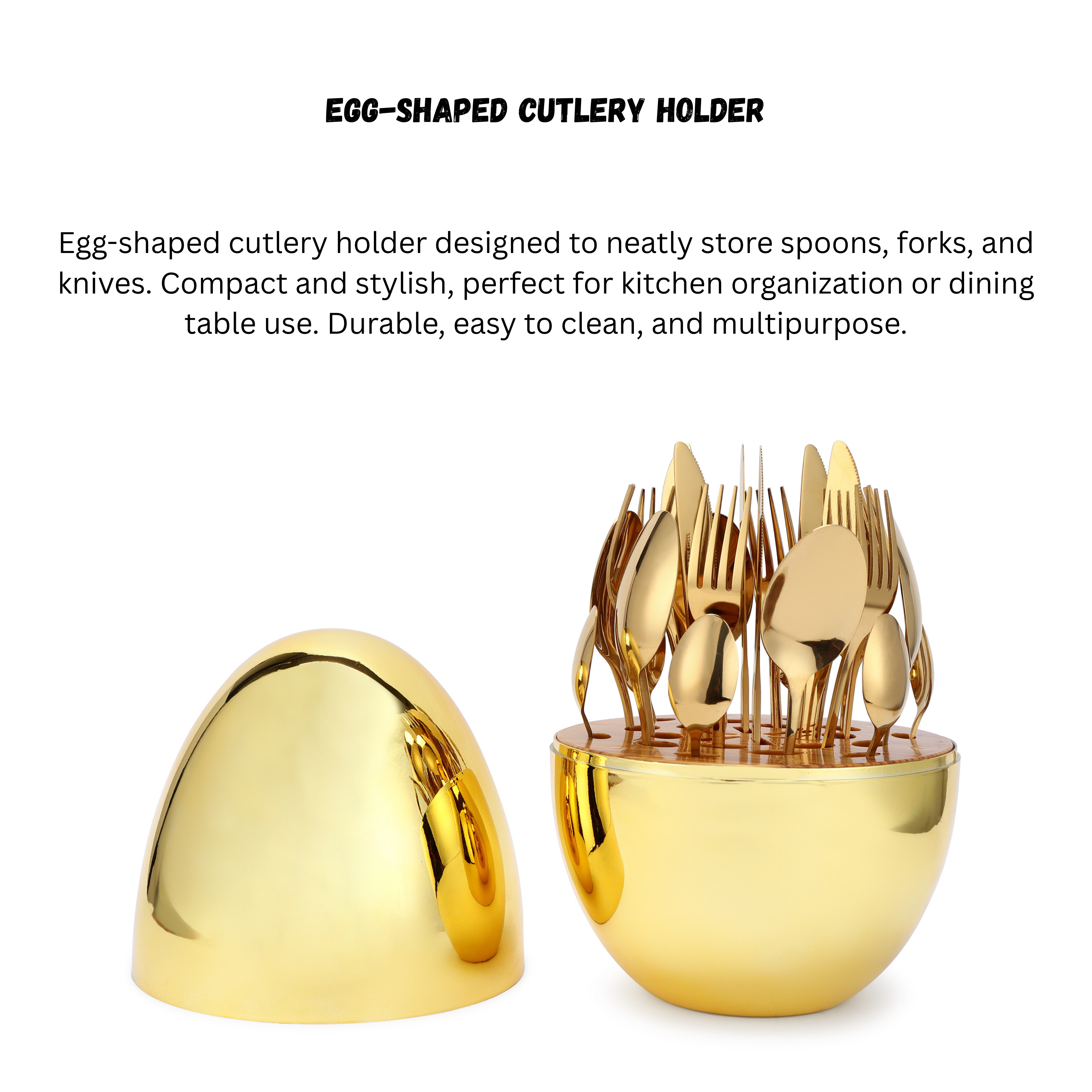 A beautifully designed Egg Shape Cutlery Holder Set made from premium-quality metal with a luxurious gold finish, crafted to enhance the charm of your dining table or kitchen space. Its unique egg-shaped structure opens up into a functional cutlery organizer for spoons, forks, and knives, and closes back into a decorative showpiece that adds sophistication to your decor. Ideal for homes, restaurants, or office pantries, it combines elegance with everyday utility. Perfect for housewarming, wedding, Diwali, and corporate gifting, this golden cutlery holder is both a statement of style and practicality.