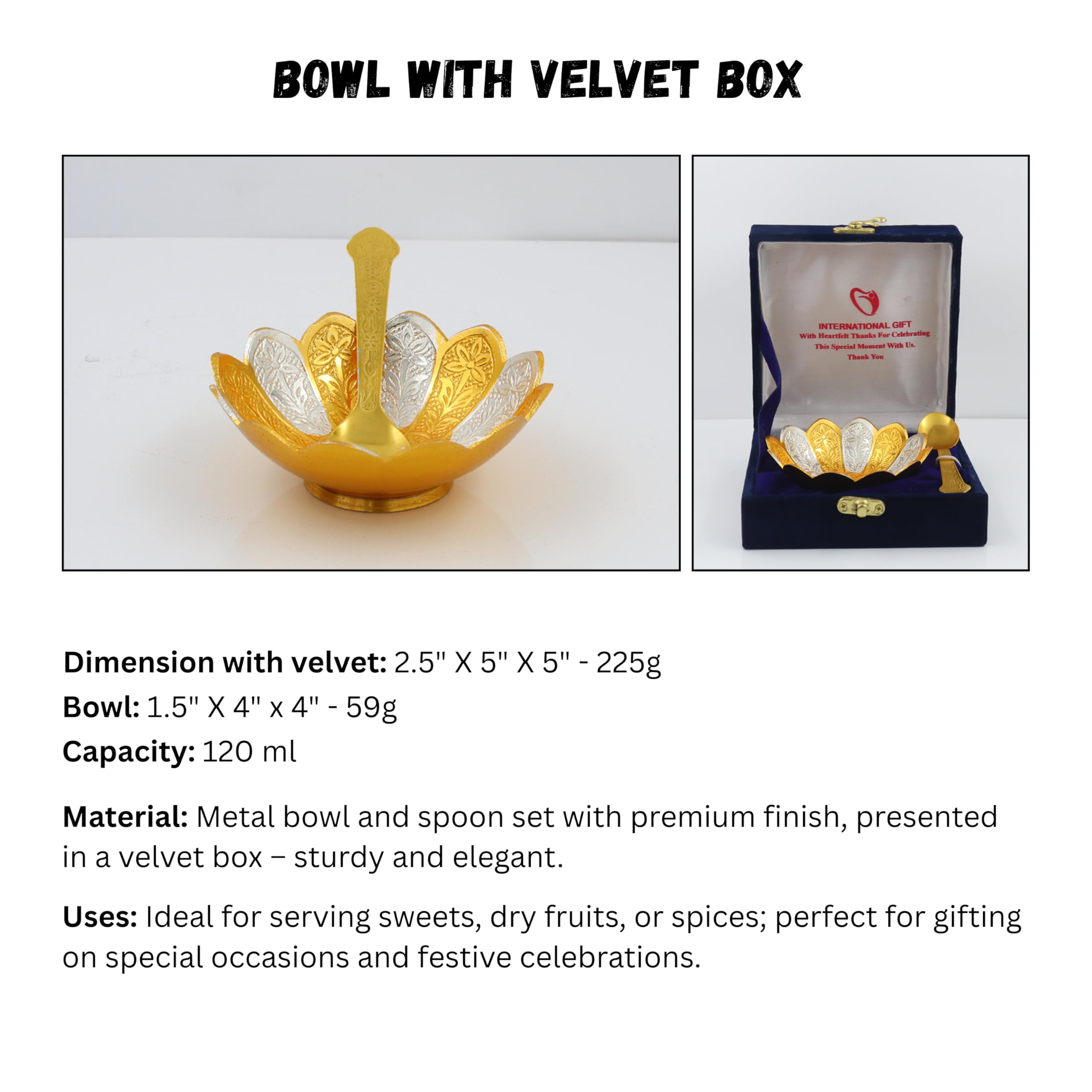 This exquisite lotus-shaped bowl with spoon, beautifully packed in a velvet box, is an ideal gift for festive celebrations, weddings, or special occasions. Designed for serving dry fruits, sweets, or treats to guests, it adds elegance and charm to any gathering. Crafted from premium metal with a polished finish, this set offers both style and durability, making it a thoughtful and practical gift for loved ones or colleagues.