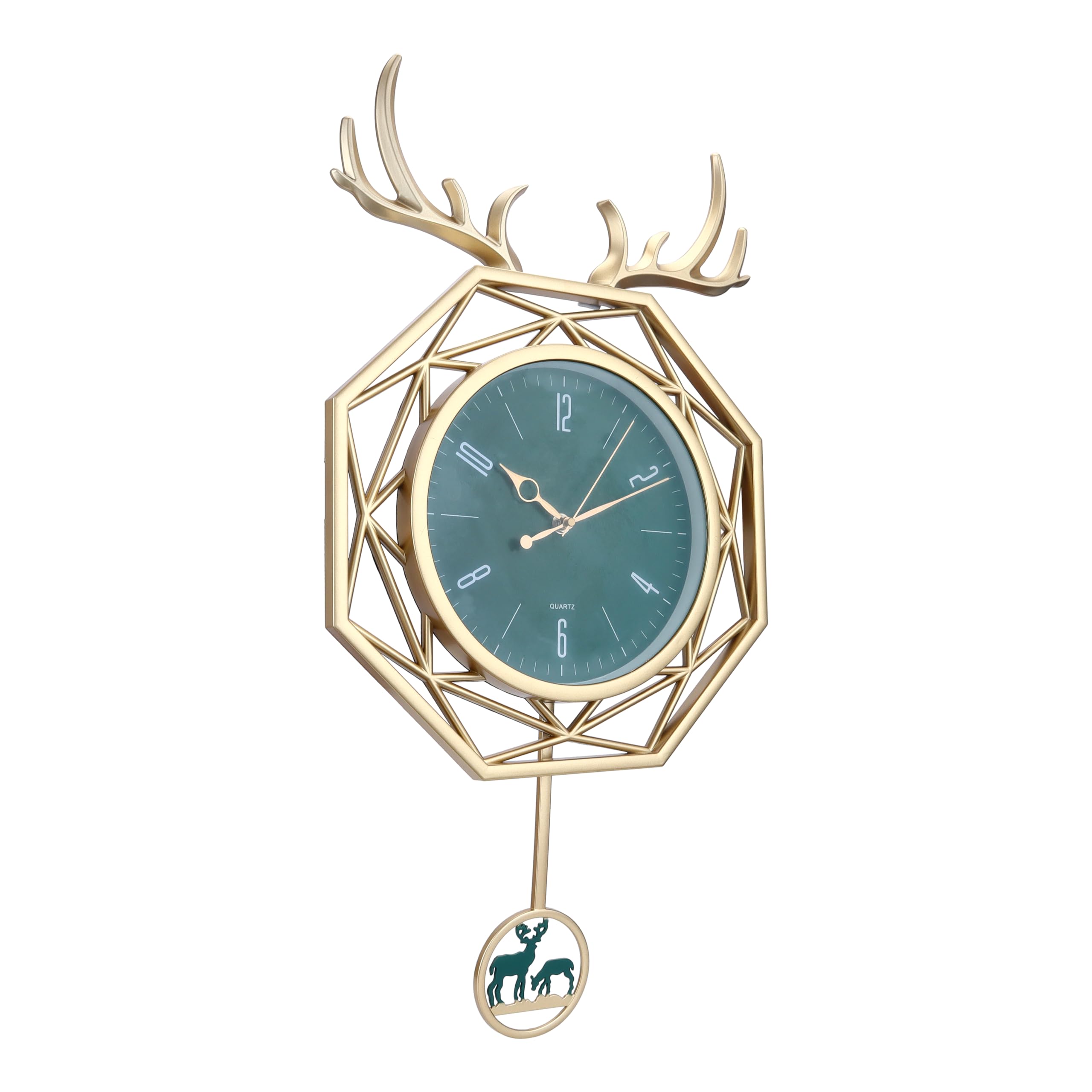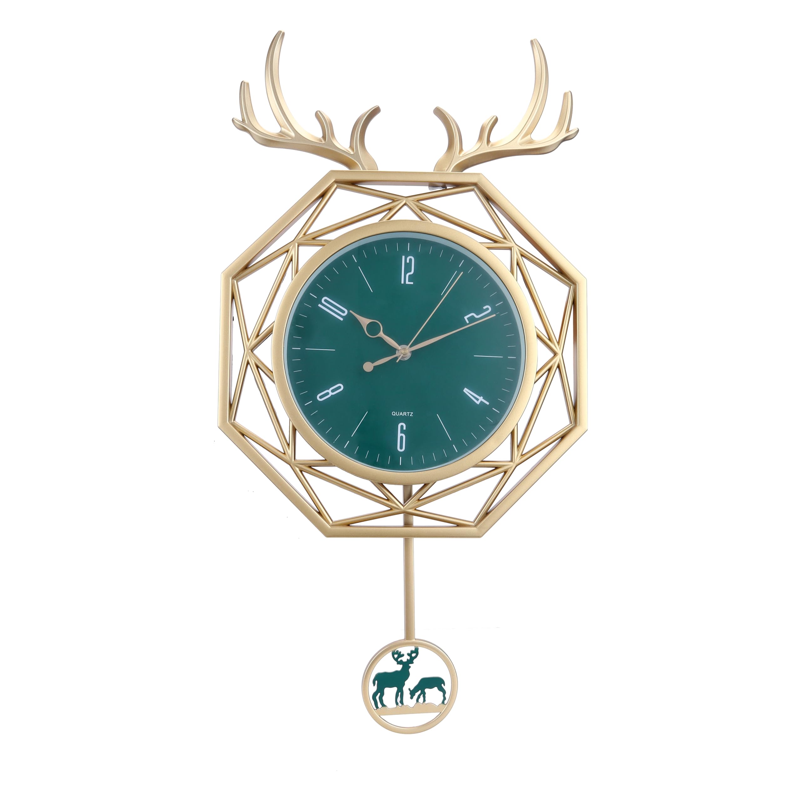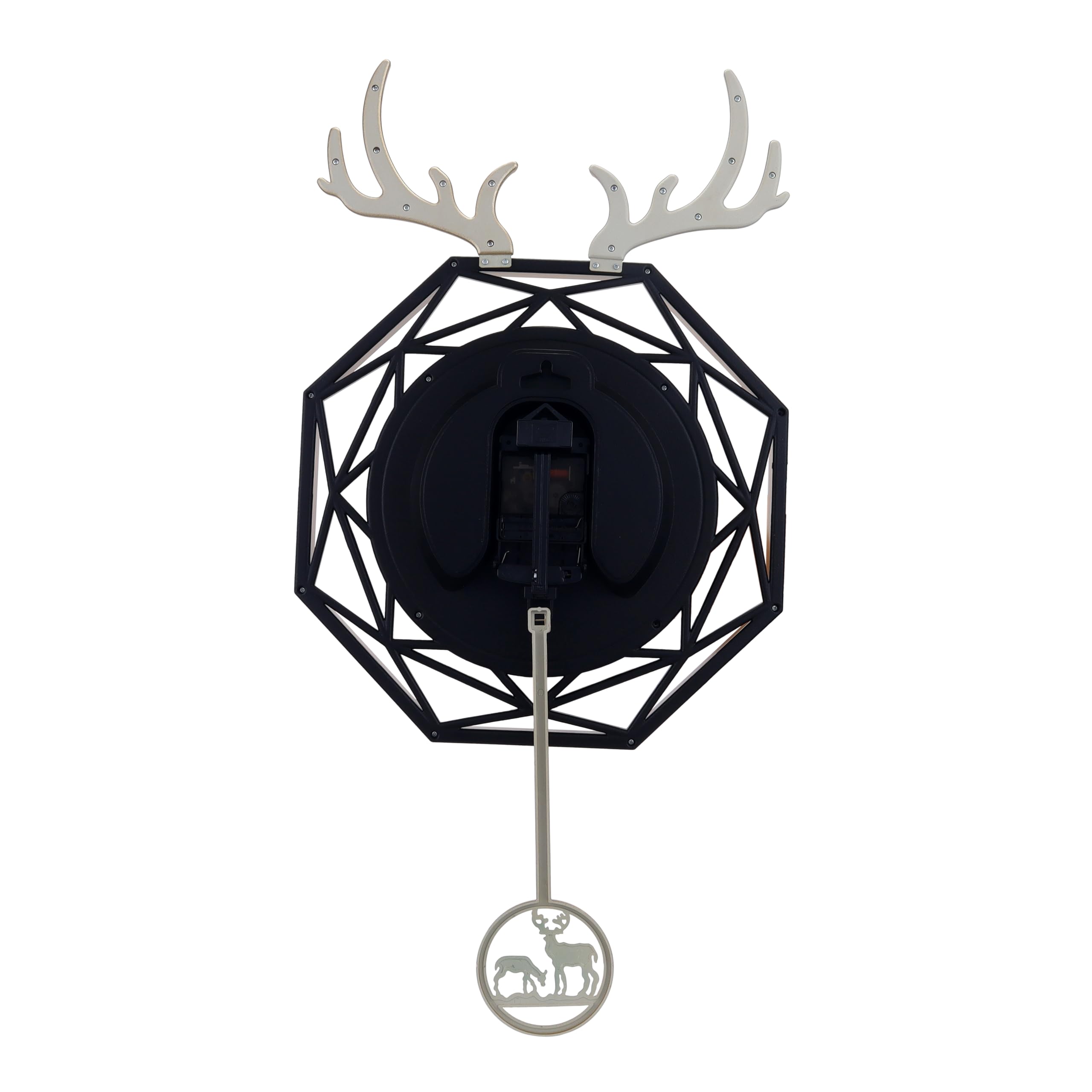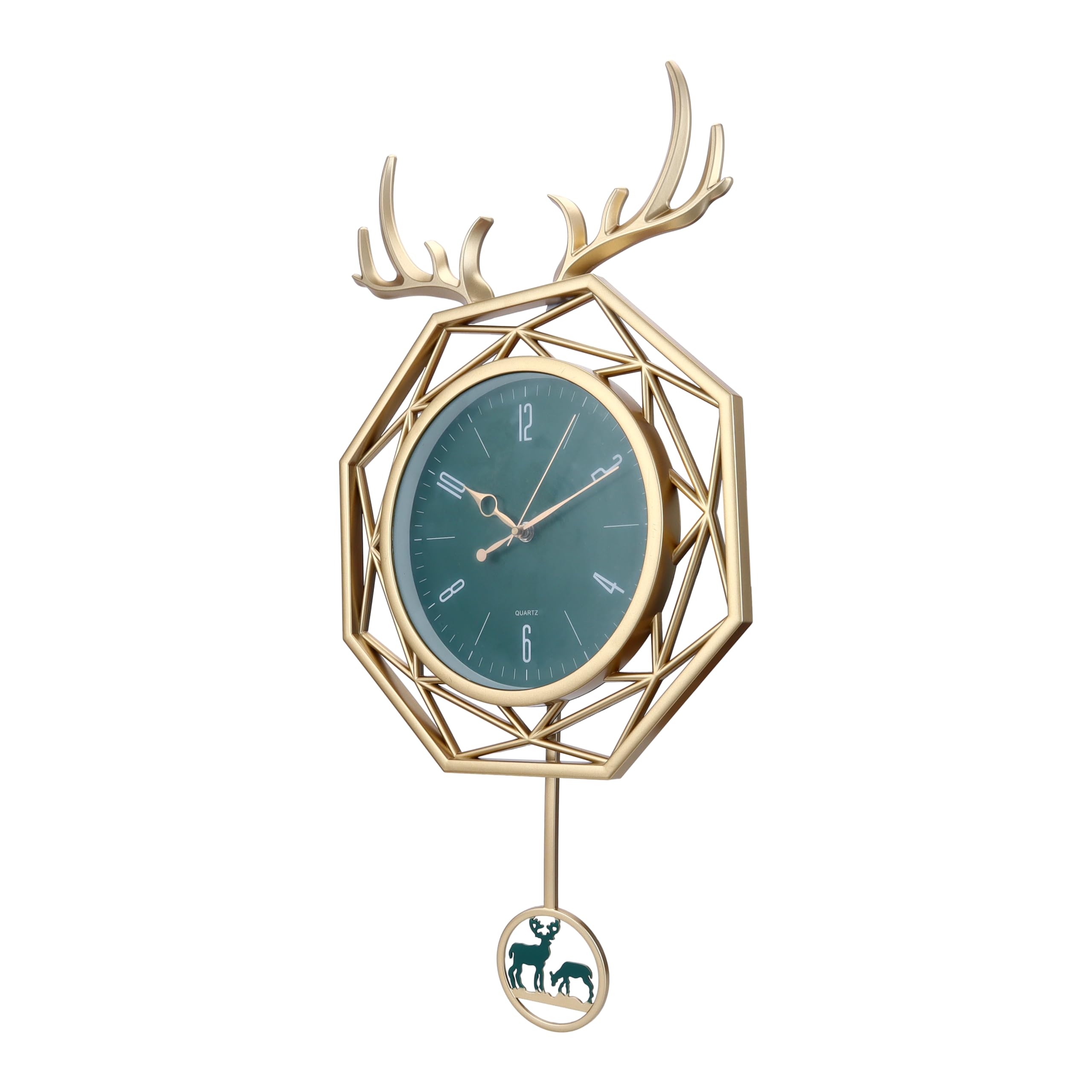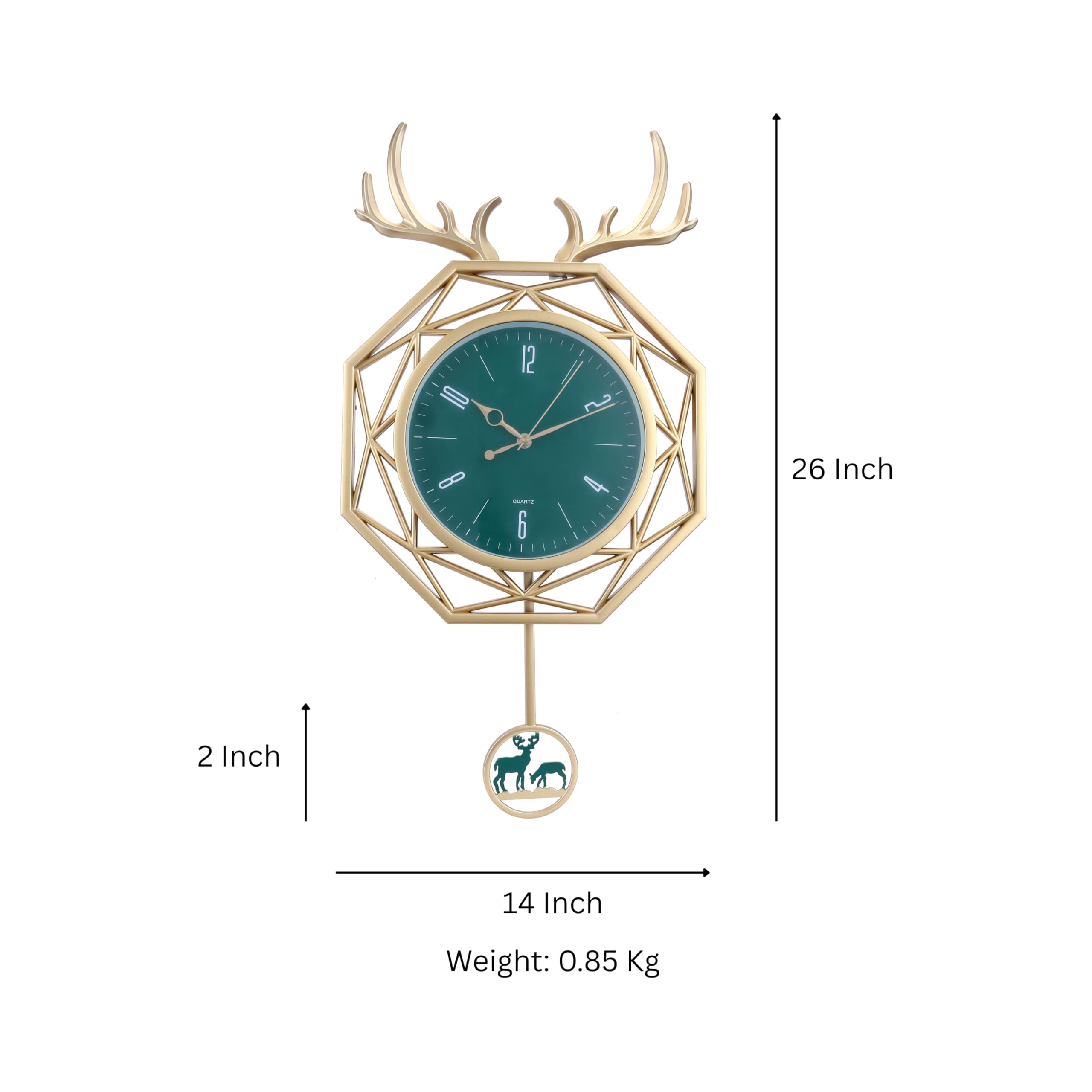 This stylish deer design wall clock with pendulum is a perfect blend of modern décor and functionality. Crafted with a unique geometric frame and detailed deer accents, it adds a premium touch to any space. The smooth quartz movement ensures accurate timekeeping, while the pendulum feature enhances its charm. Ideal for living rooms, bedrooms, offices, or gifting, this clock is available in Black and Green & Gold variants to suit different décor themes. Durable, lightweight, and easy to hang, it is designed to make your walls stand out beautifully.