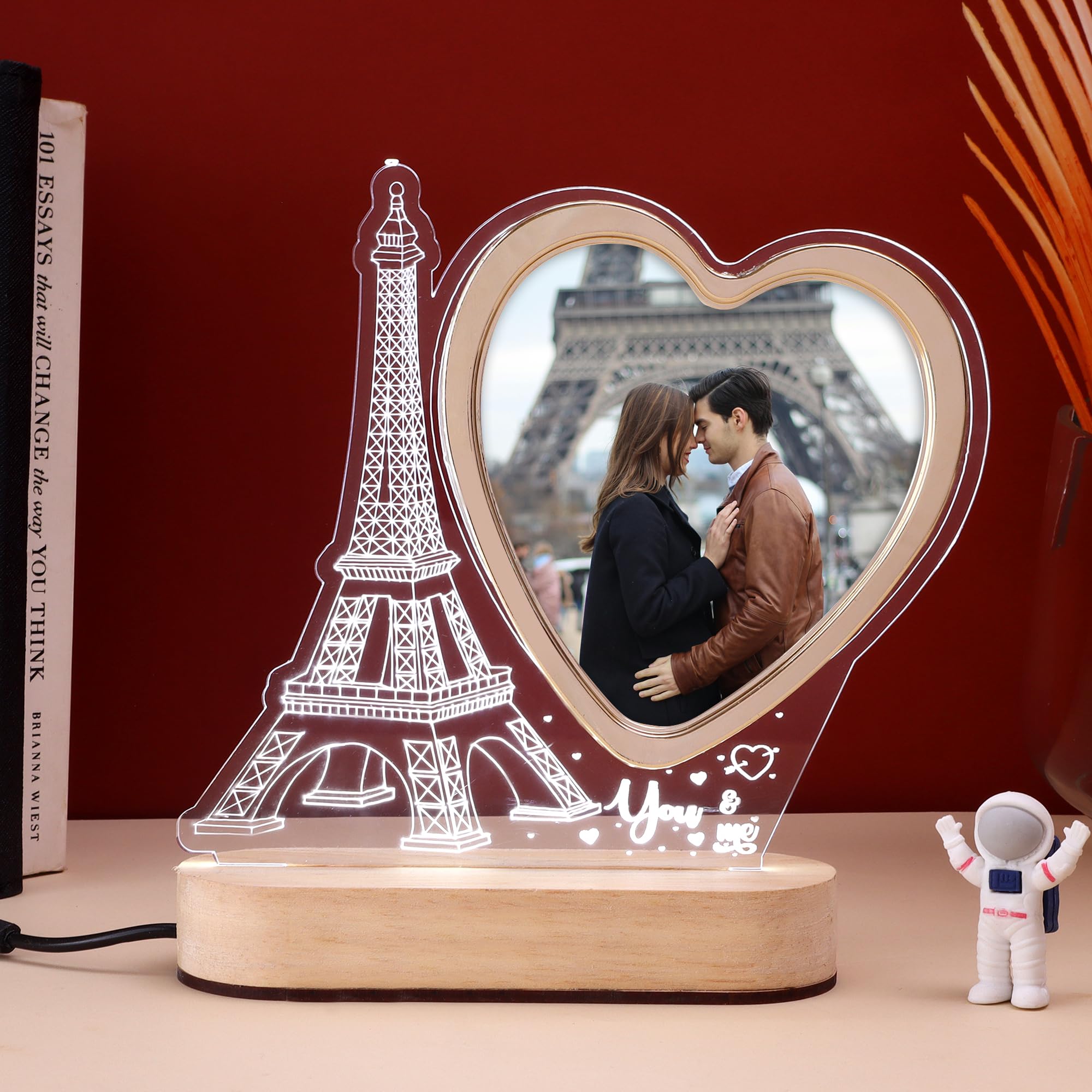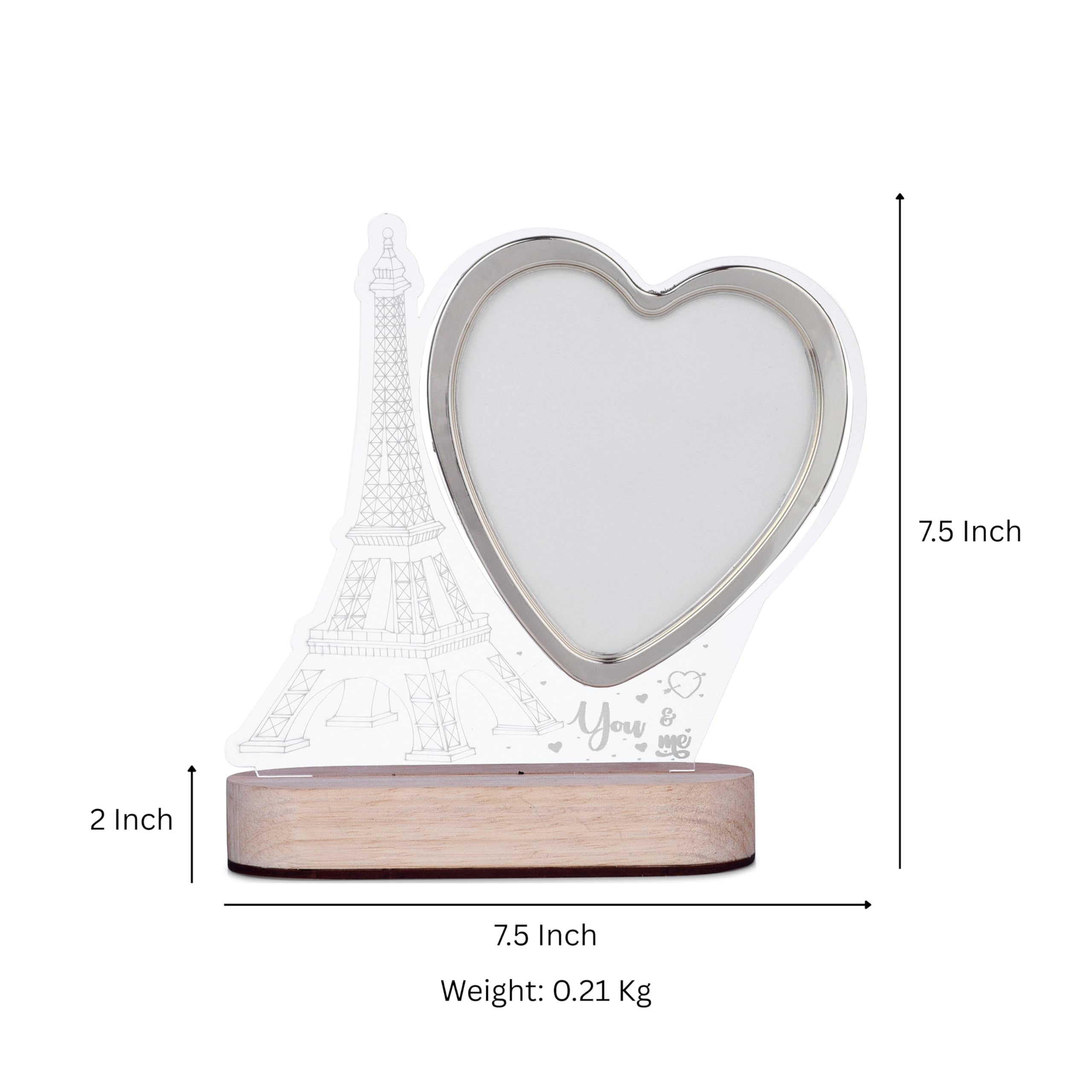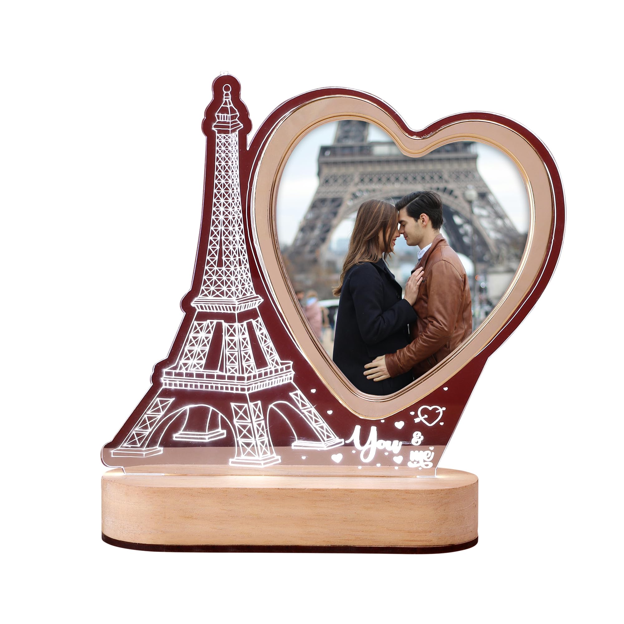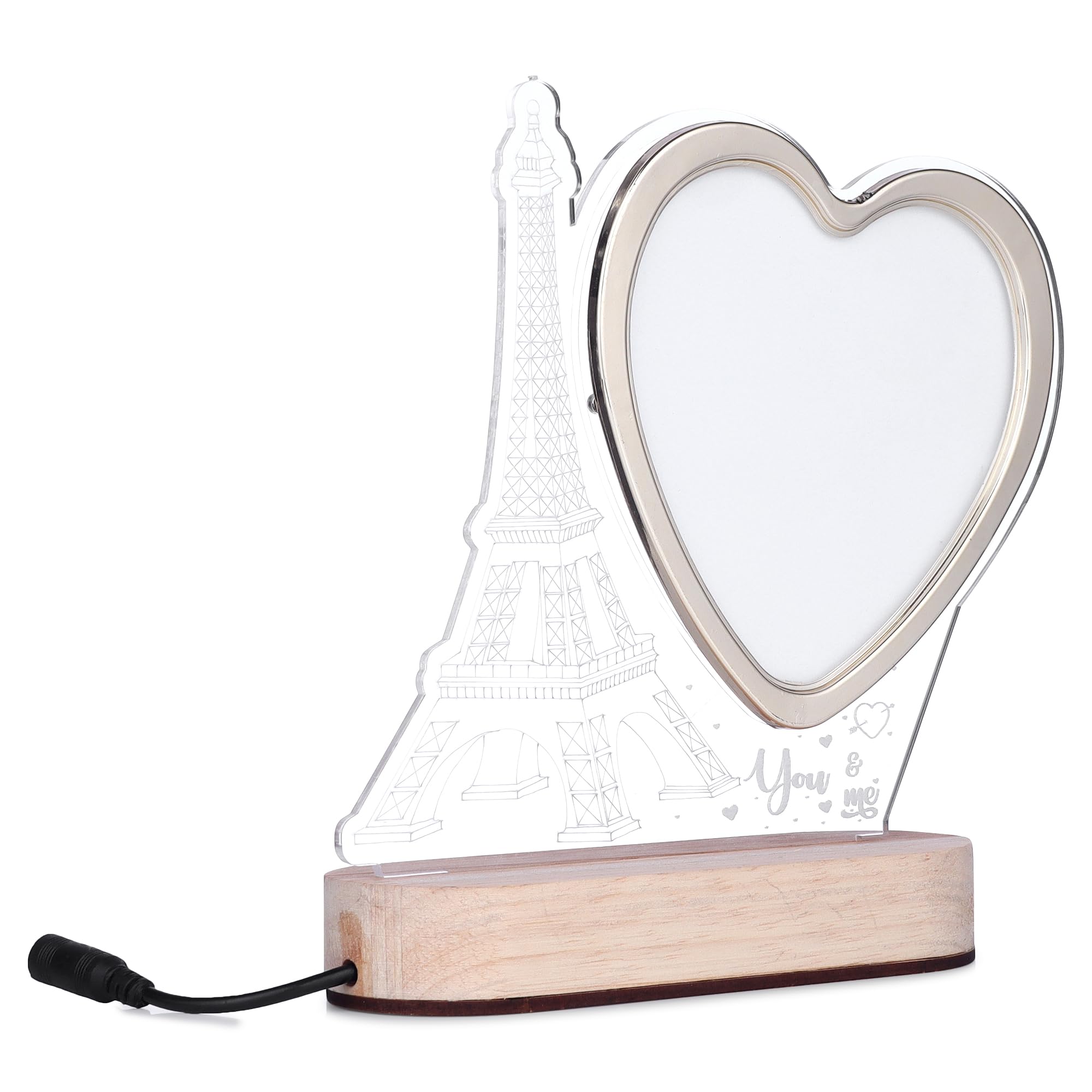 Romantic LED heart-shaped photo frame featuring a beautifully crafted Eiffel Tower design on a sturdy wooden base. Perfect for gifting on anniversaries, weddings, or Valentine’s Day, this elegant frame adds charm and warmth to any home decor, making it ideal for bedrooms, living rooms, or study areas.