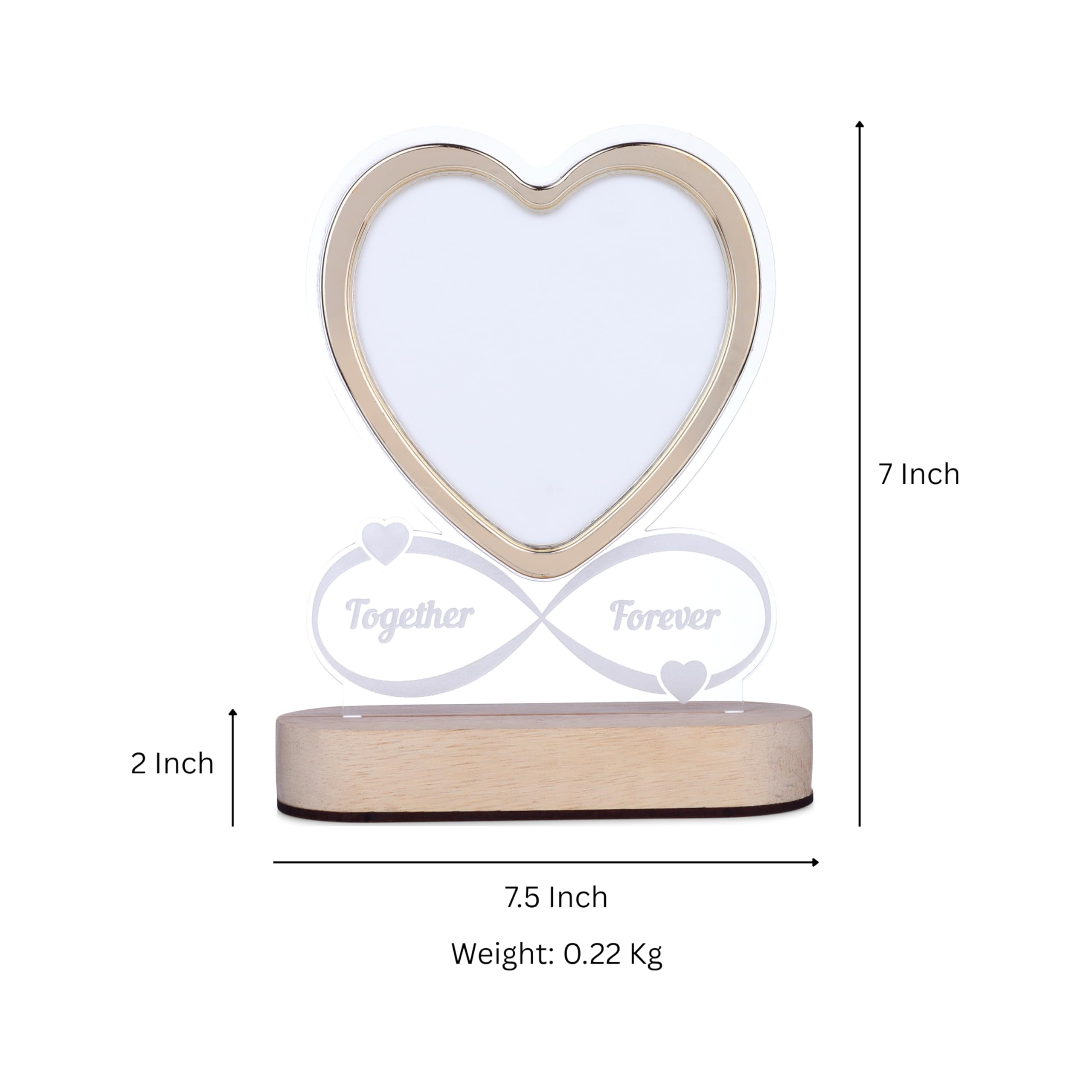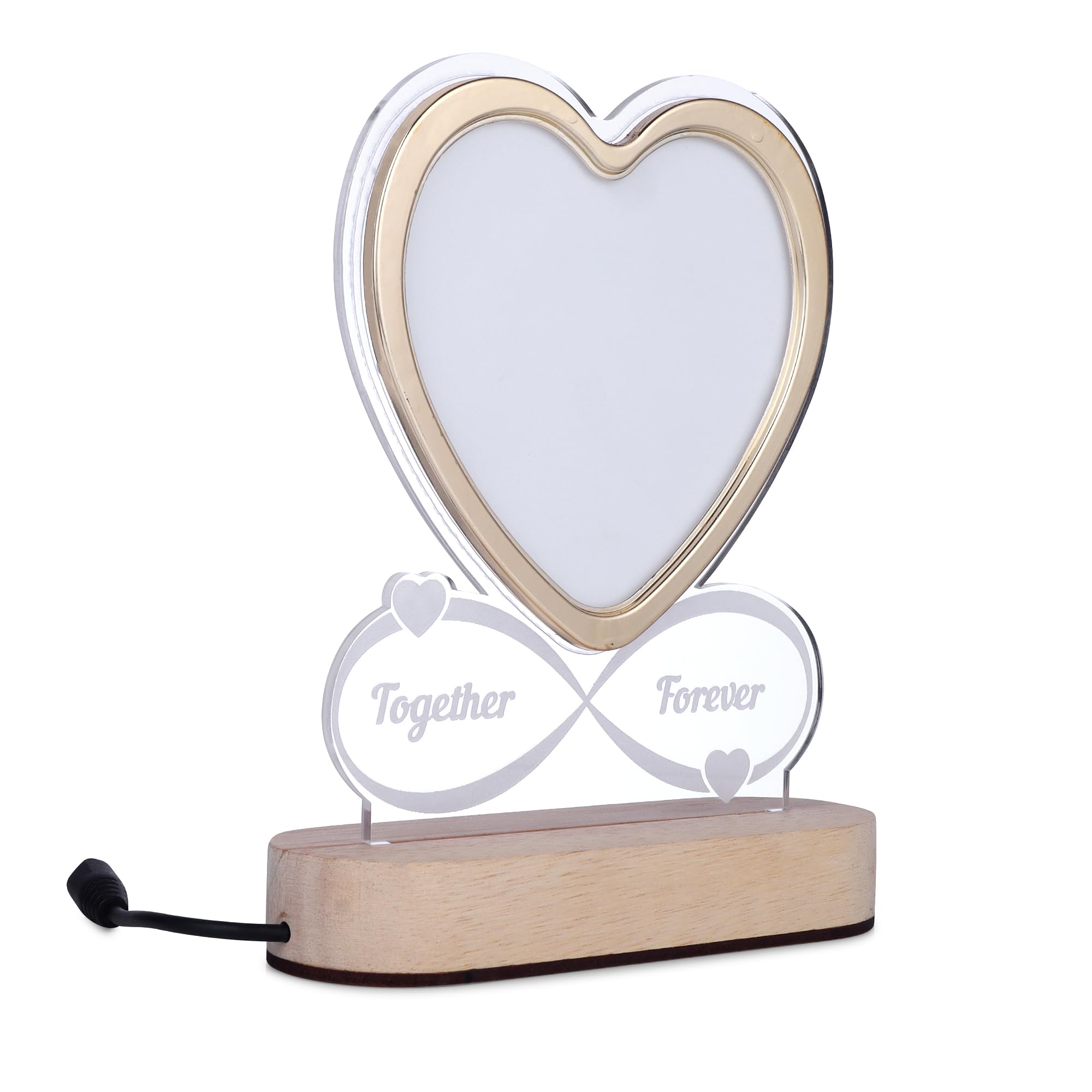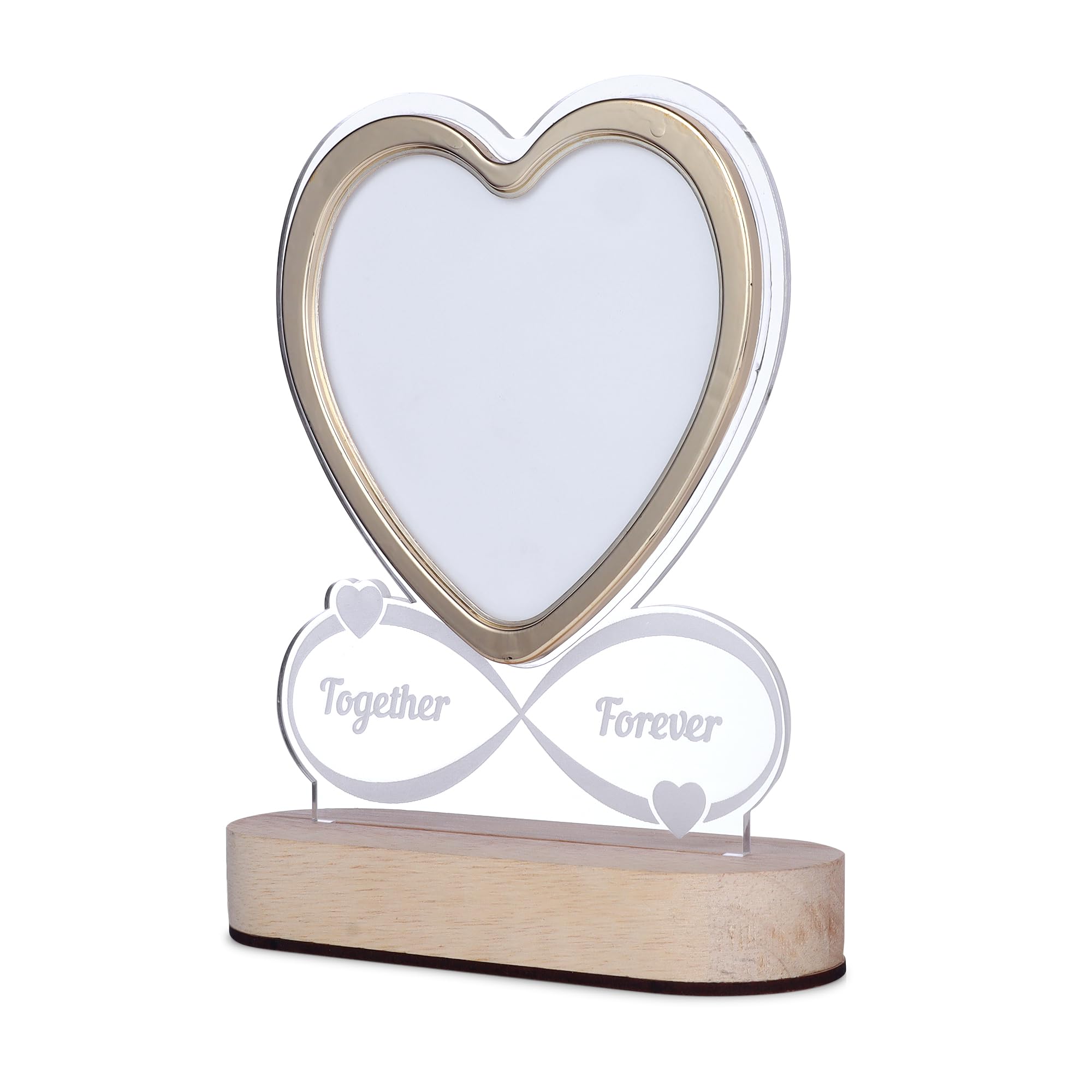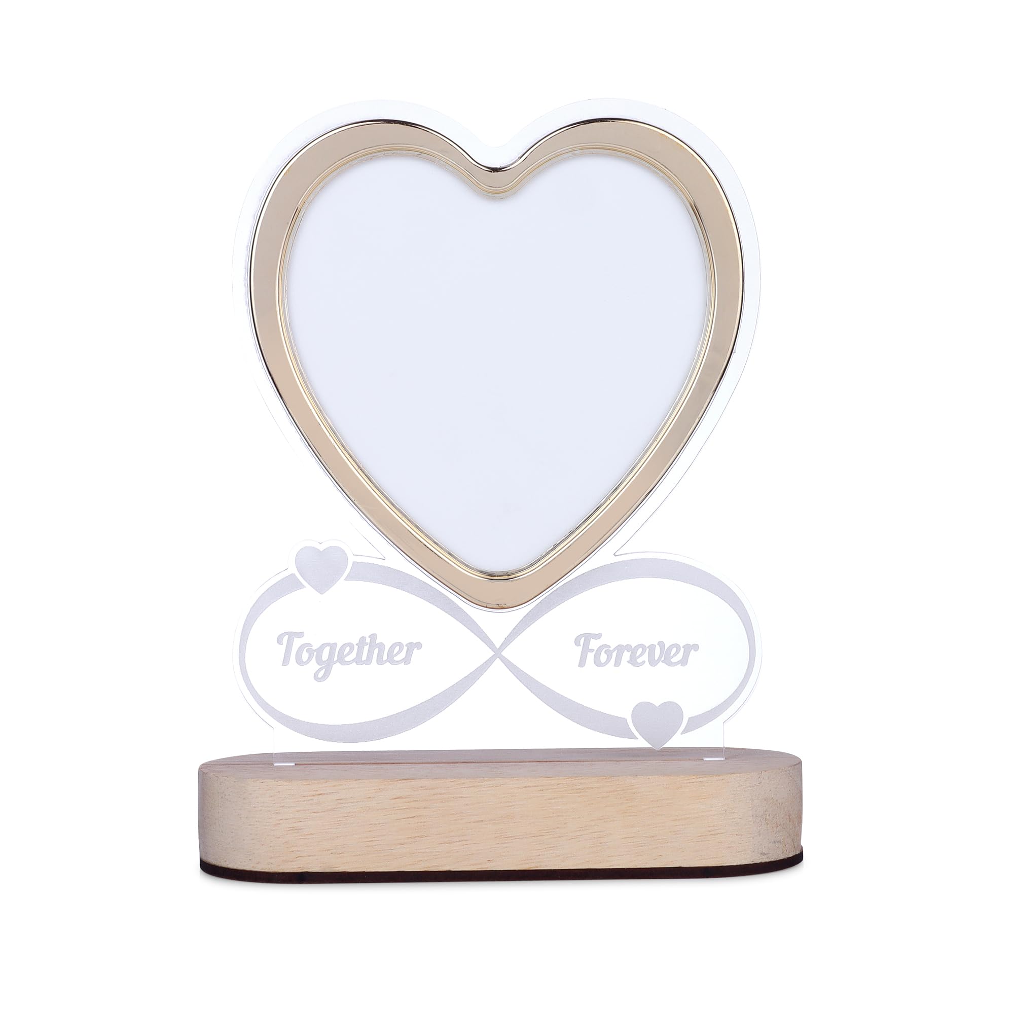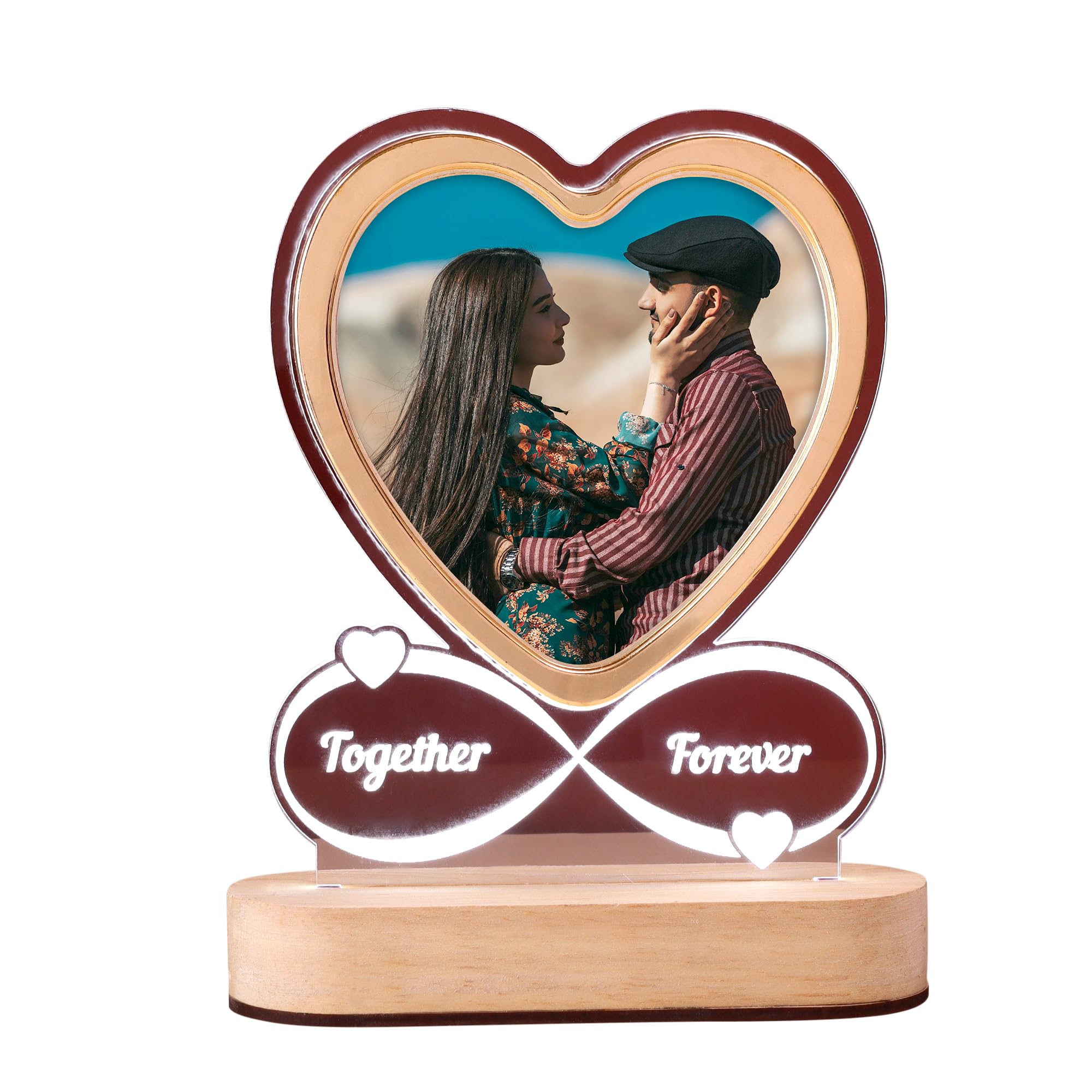 Romantic LED heart-shaped photo frame featuring glowing “Together Forever” text on a sturdy wooden base. Perfect for gifting on anniversaries, weddings, or Valentine’s Day, this elegant frame adds warmth and charm to any home decor, making it an ideal centerpiece for bedrooms, living rooms, or study areas.