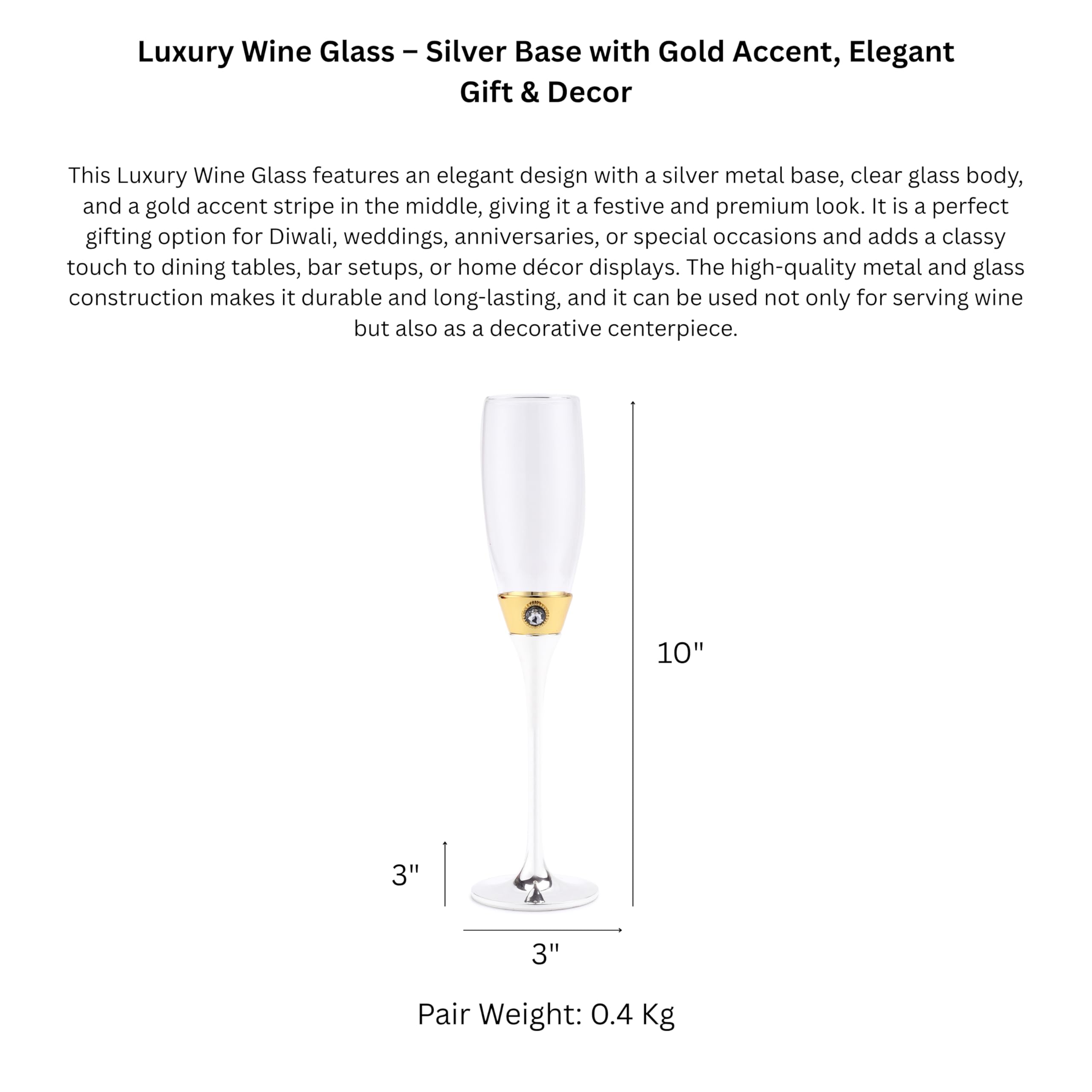Elevate your celebrations with this Luxury 2-Piece Wine Glass Set;elegantly packaged in a gift box. Featuring a sturdy metal base and a clear glass top;these glasses combine durability with a sophisticated design;perfect for serving wine or other beverages in style. Ideal for Diwali;weddings;housewarmings;or festive gift hampers;this set adds a luxurious touch to dining tables or display cabinets. Lightweight yet premium in feel;it also makes a thoughtful gift for friends and loved ones.
