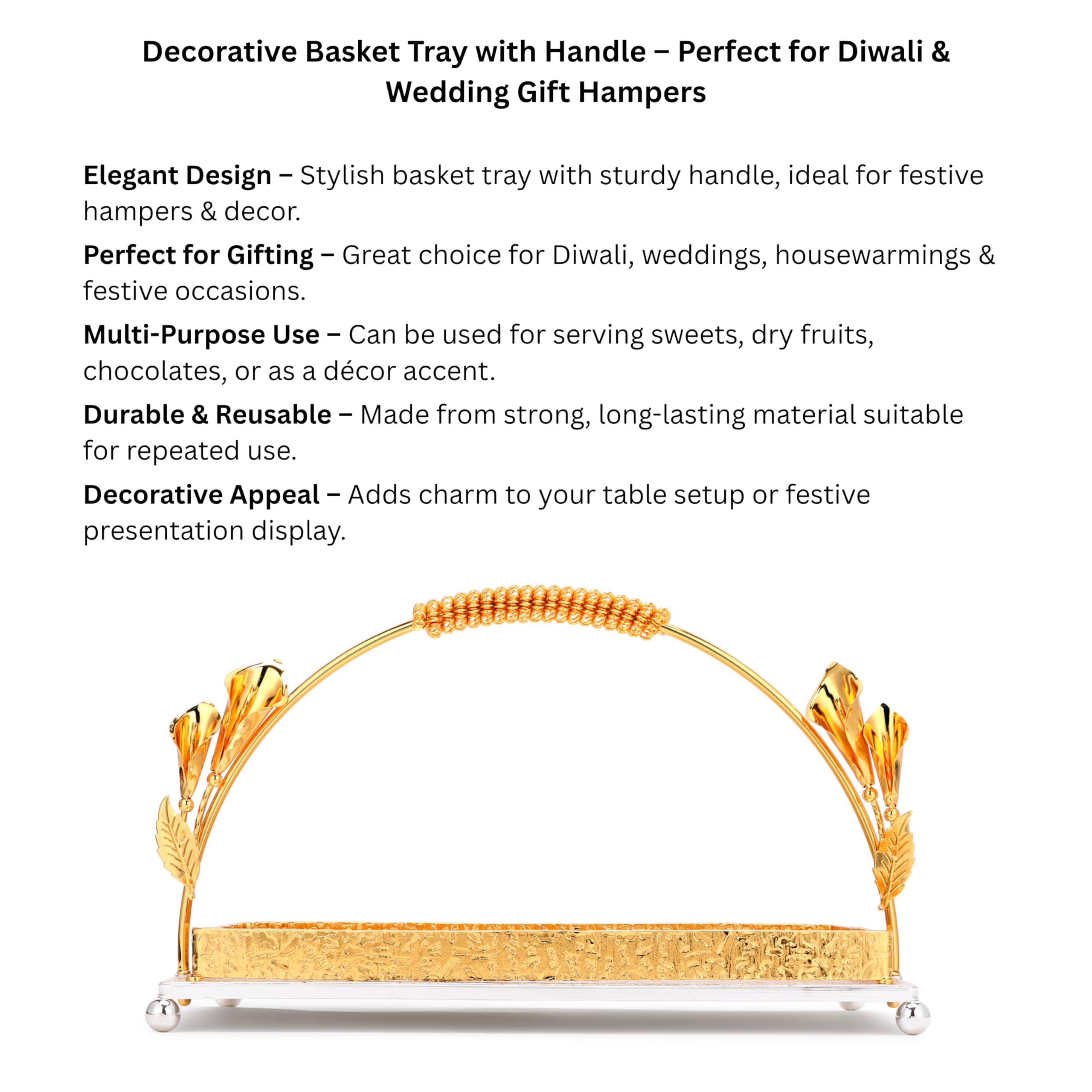 Elevate your festive celebrations with this Luxury Basket Tray;designed to elegantly serve dry fruits;snacks;or fresh fruits. Perfect for Diwali;weddings;housewarmings;or creating exquisite gift hampers;it combines style with functionality. Its premium decorative design enhances dining tables;buffet setups;or living room displays;making it an ideal choice for gifting or personal use. Lightweight yet sturdy;it ensures effortless serving while adding a luxurious and festive touch to any occasion.