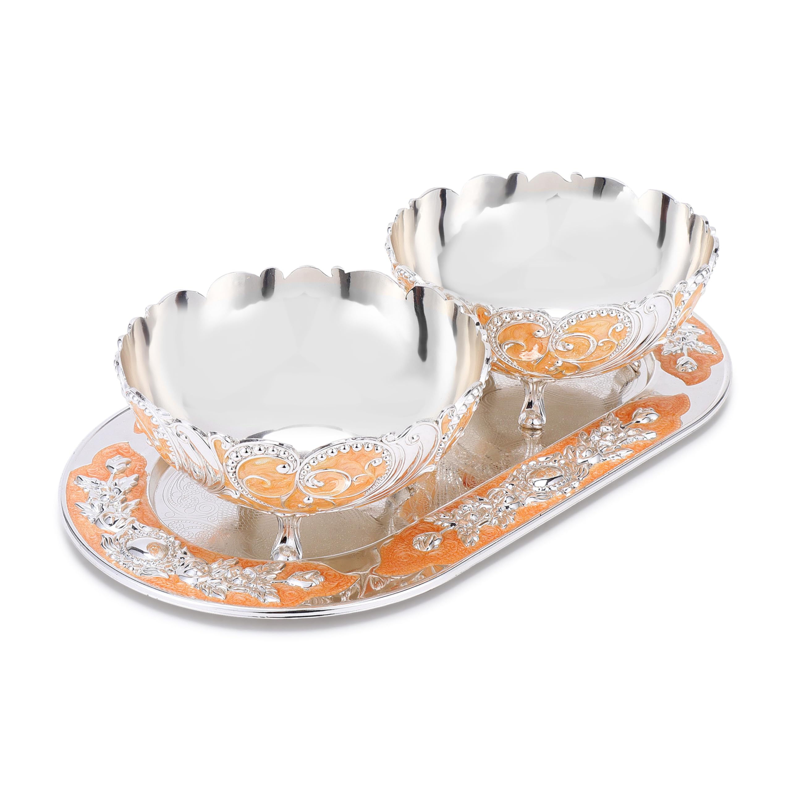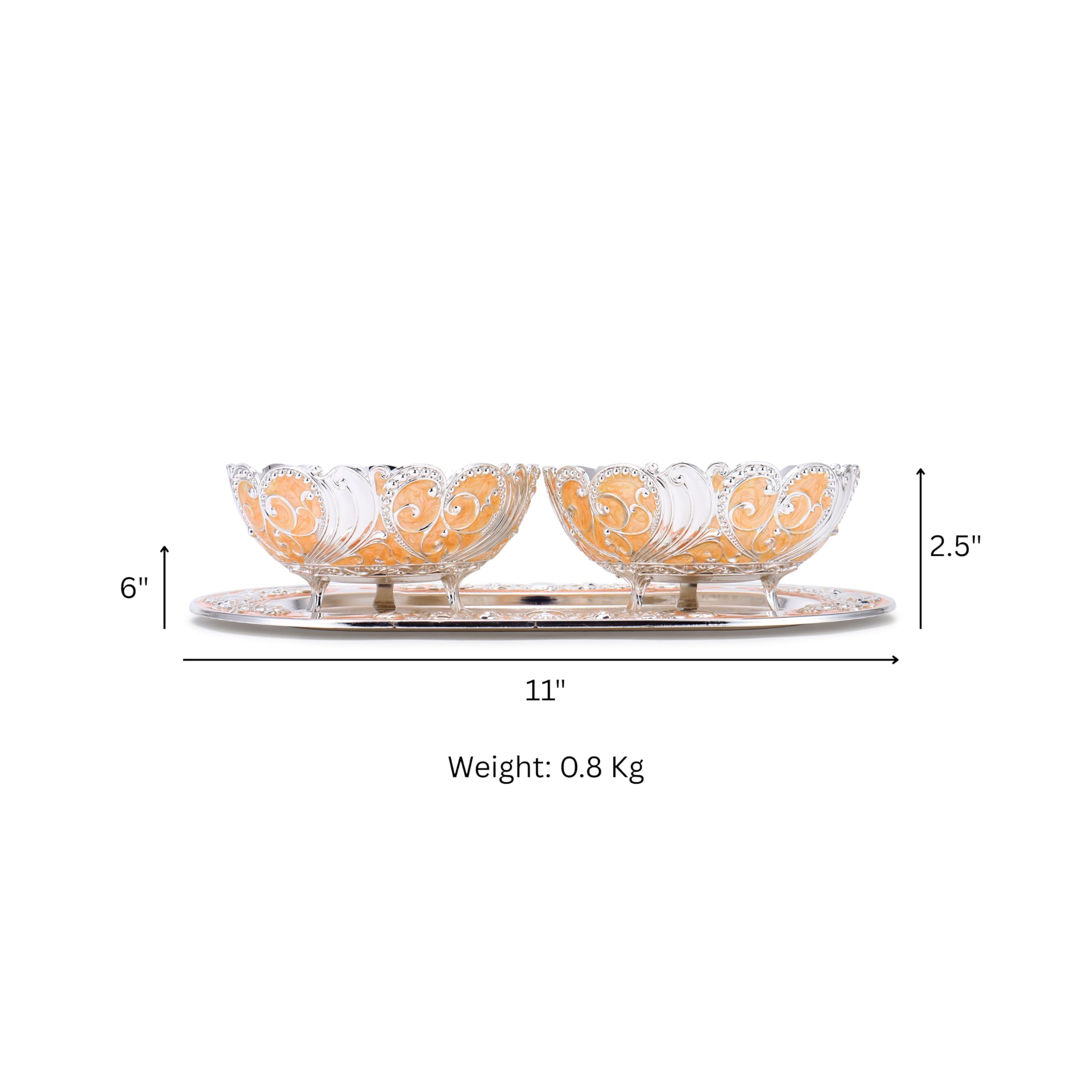 Celebrate festive occasions and special gatherings with this luxury dry fruits bowl set. Crafted from premium metal, the set includes two elegant bowls and a matching tray, combining style with functionality. Perfect for serving dry fruits, sweets, nuts, or snacks, it enhances the aesthetic of your dining or coffee table. Its stylish design makes it ideal for gifting during Diwali, weddings, housewarmings, or other celebrations. This set not only serves as a functional serving solution but also adds a touch of sophistication and luxury to your home decor.