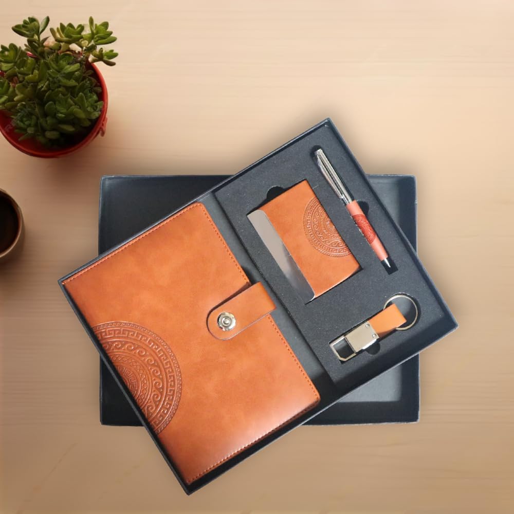 A thoughtfully curated executive gift set featuring a smooth-writing pen, a premium diary, a stylish keychain, and a practical card holder. Perfect for professionals, this set combines practicality, style, and convenience — an ideal token of appreciation for employees, clients, and business partners.