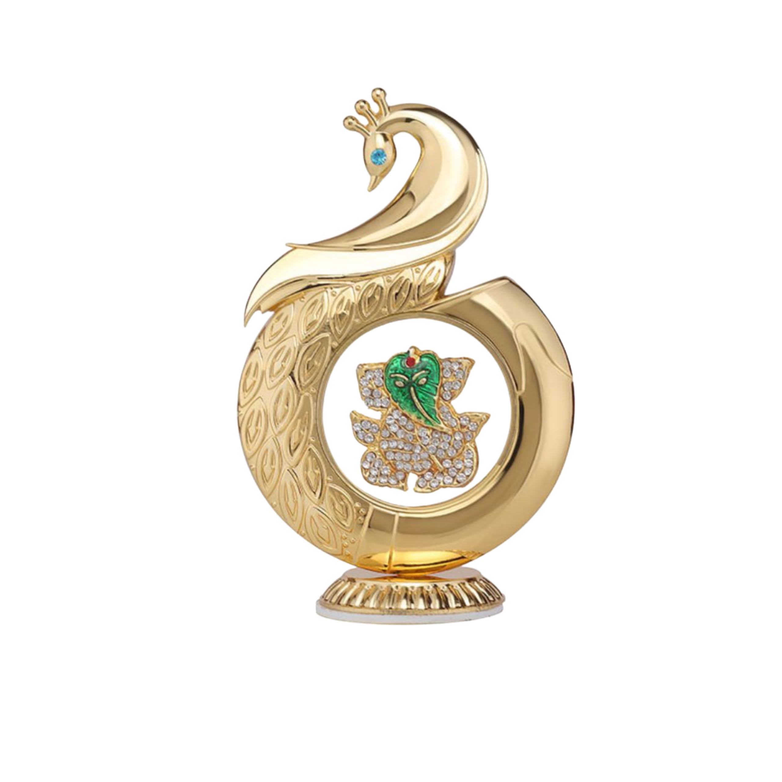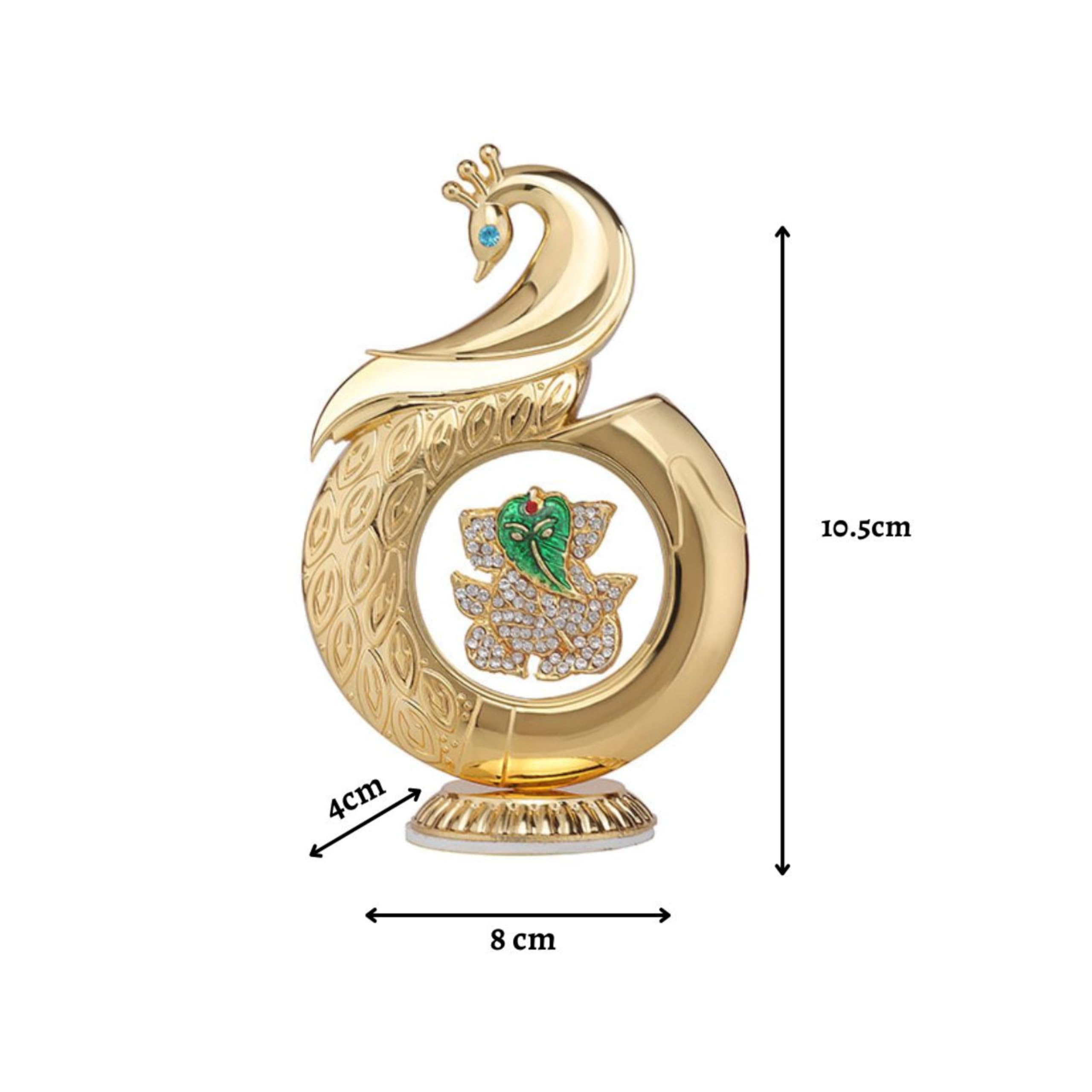 This Metal Peacock Ganesha Car Dashboard Showpiece combines elegant craftsmanship with spiritual charm, featuring a gold-toned peacock frame and a crystal-studded Ganesha idol at the center. Designed specifically for dashboard placement, it includes a strong adhesive base that ensures stability even during movement. With its compact size, premium finish, and divine detailing, it is perfect for use in cars, offices, prayer rooms, or living spaces. This showpiece also makes a thoughtful and meaningful gift for festive occasions and spiritual celebrations.