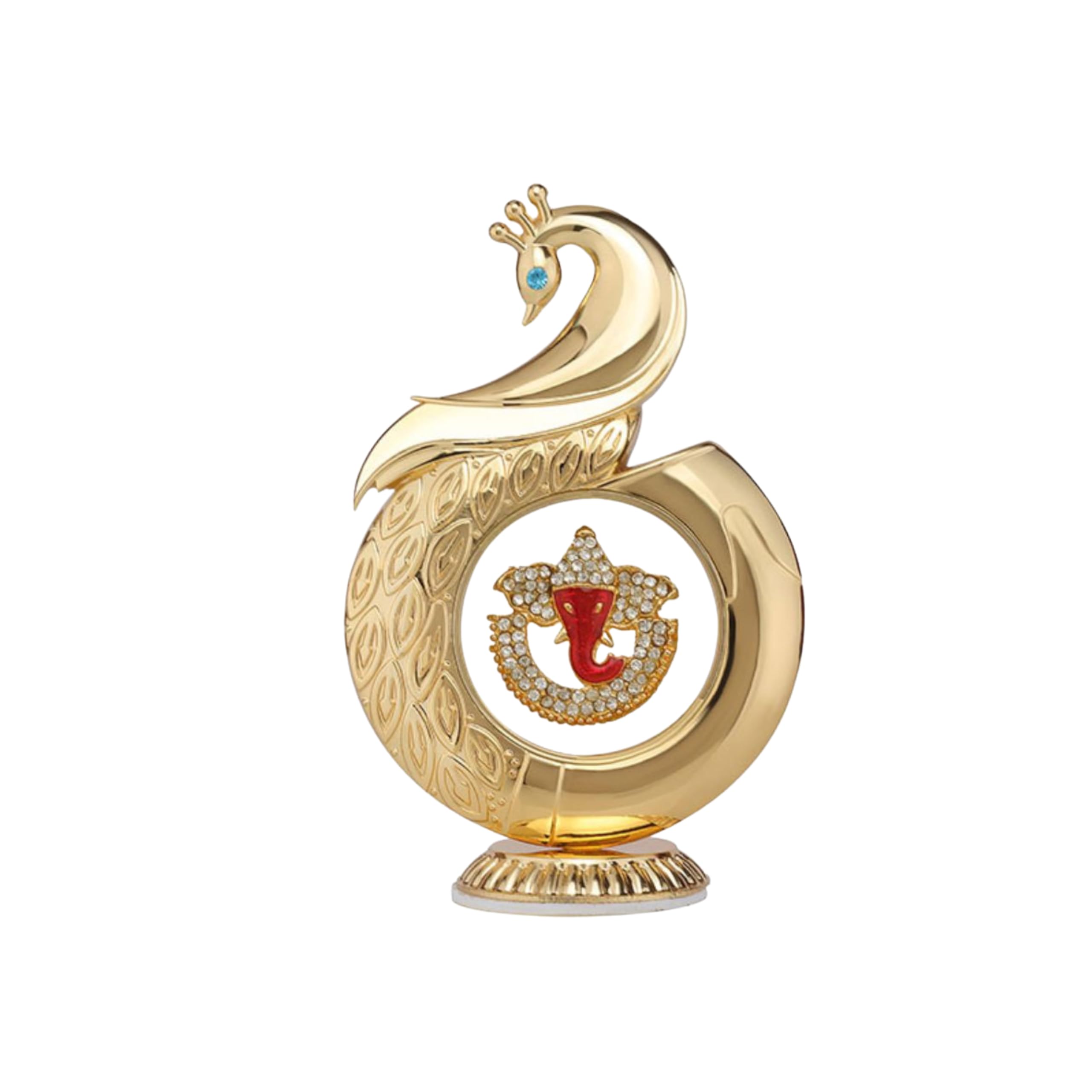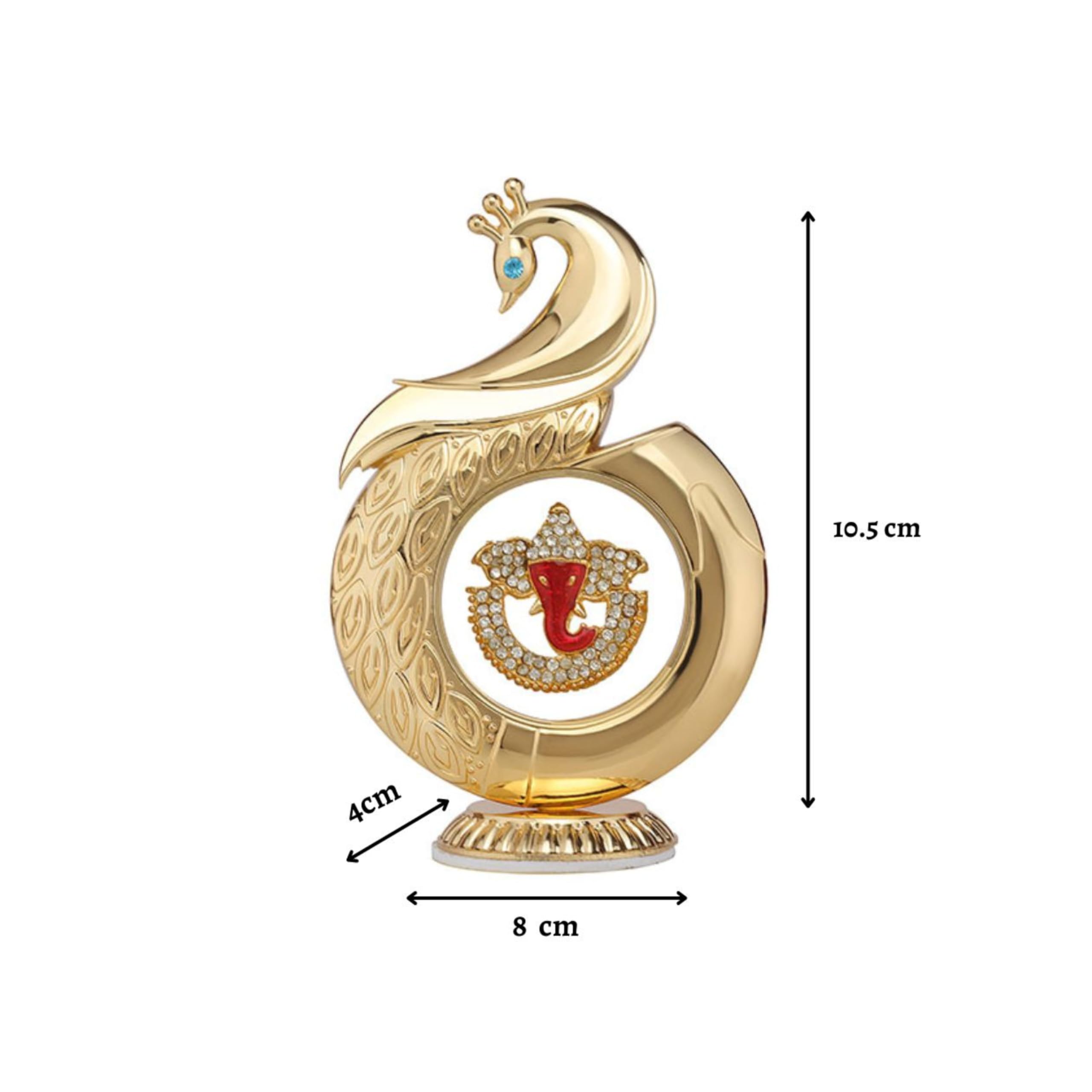This Metal Peacock Ganpati Symbol Car Dashboard Showpiece blends luxury design with spiritual significance, featuring a gold-toned peacock frame and a crystal-studded Ganpati emblem at the center. Its strong adhesive base ensures firm placement on car dashboards even during movement. With its premium finish, compact size, and divine detailing, it is suitable for cars, offices, living rooms, and pooja spaces. A beautiful and meaningful décor accessory, it also makes a thoughtful gift for festive and devotional occasions.