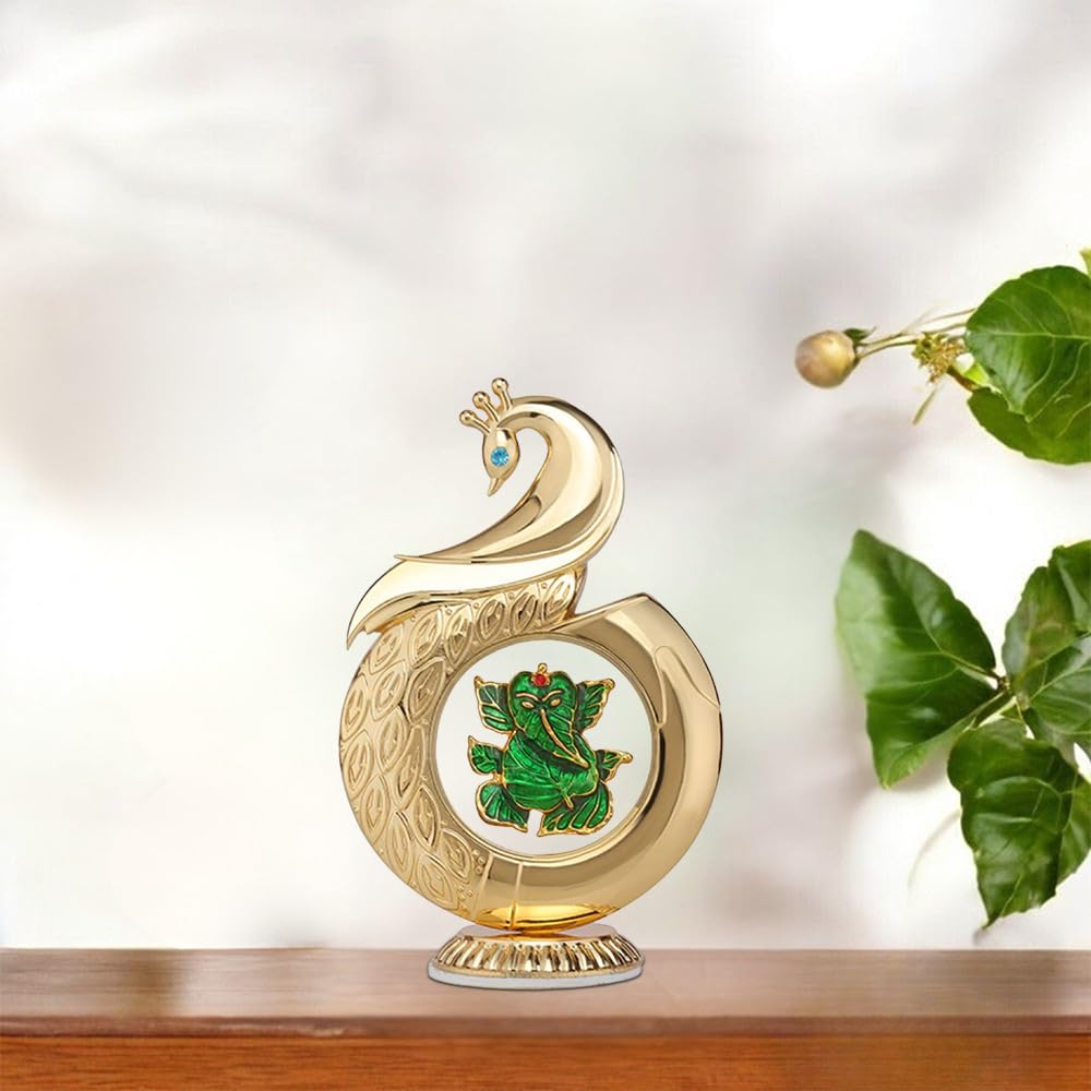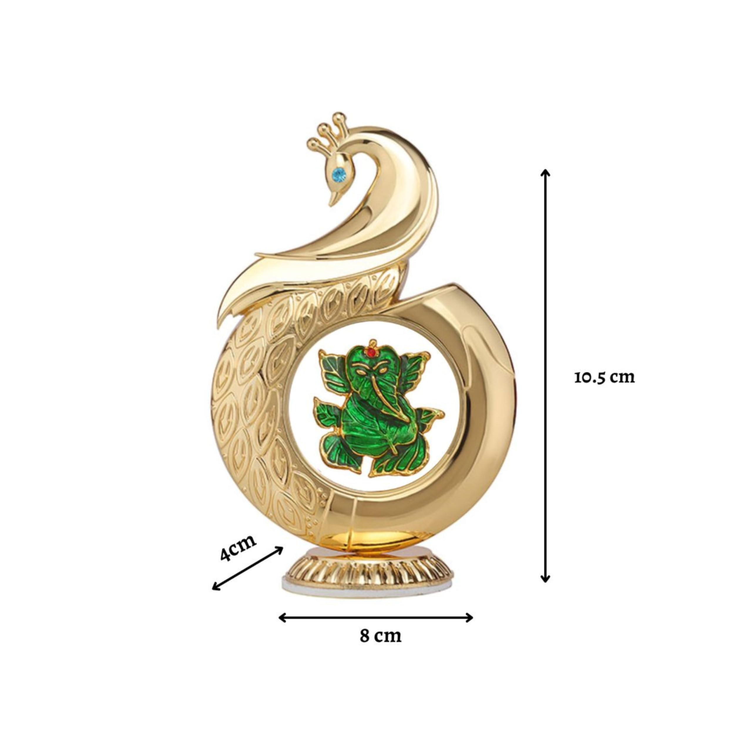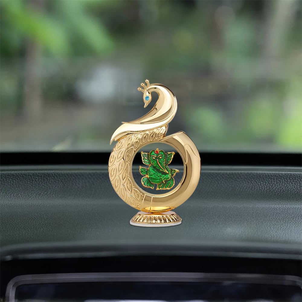 This Metal Peacock Green Ganesha Car Dashboard Showpiece blends artistic craftsmanship with divine symbolism, featuring a gold-toned peacock frame paired with a vibrant green enamel Ganesha idol at its center. Its strong adhesive base ensures secure placement on dashboards even during bumpy rides, while the compact size and premium finish make it equally suitable for home or office décor. With its elegant detailing and spiritual appeal, this showpiece also makes a thoughtful gift for festive and devotional occasions.
