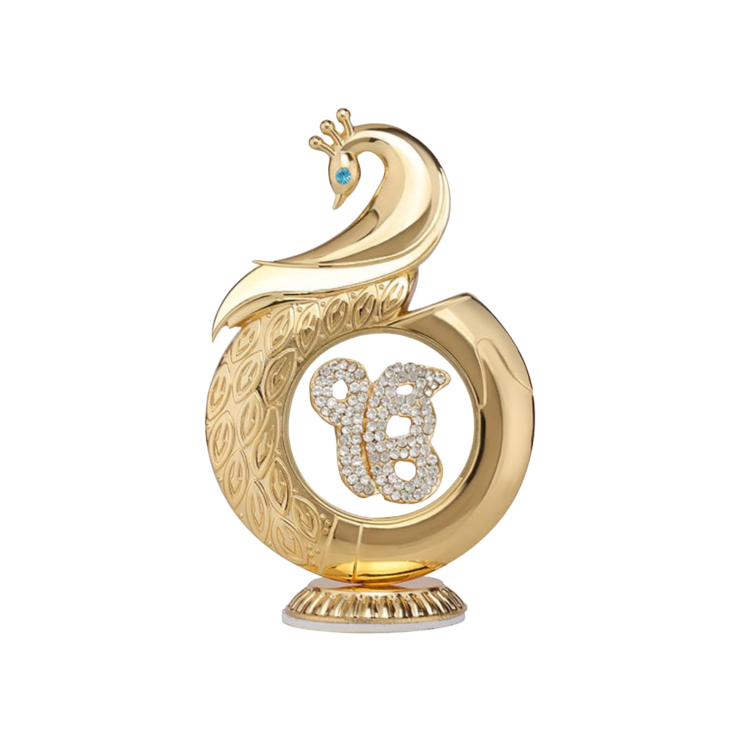 The International Gift Metal Peacock Ik Onkar Dashboard Idol is a premium spiritual accessory crafted from high-quality metal and finished in a rich golden tone for an elegant, long-lasting look. At its center sits a finely studded Ik Onkar symbol, representing divine unity and positivity. Designed for car dashboards, it includes a powerful adhesive base that ensures firm placement on any smooth surface. The stylish peacock frame adds a decorative touch, making it perfect for home, office, or car décor. A wonderful and thoughtful gift for loved ones on spiritual and festive occasions.