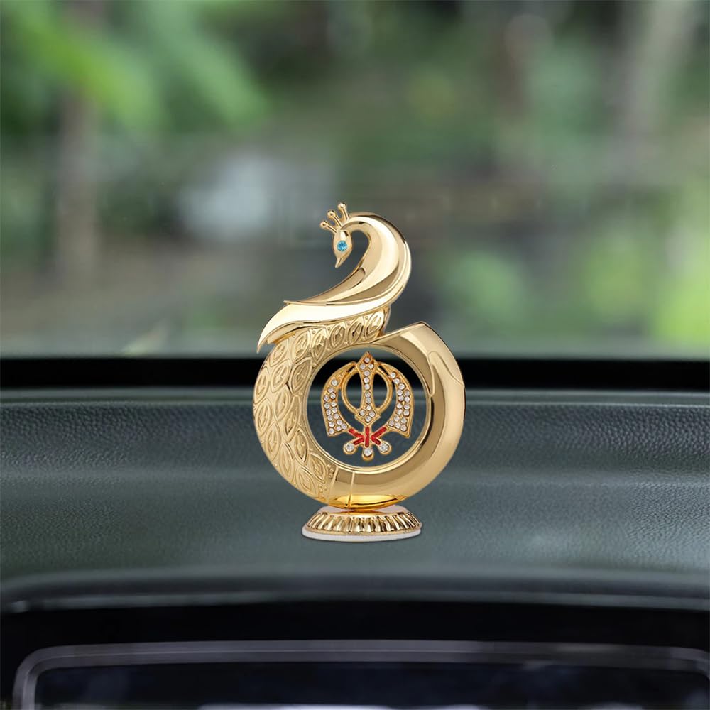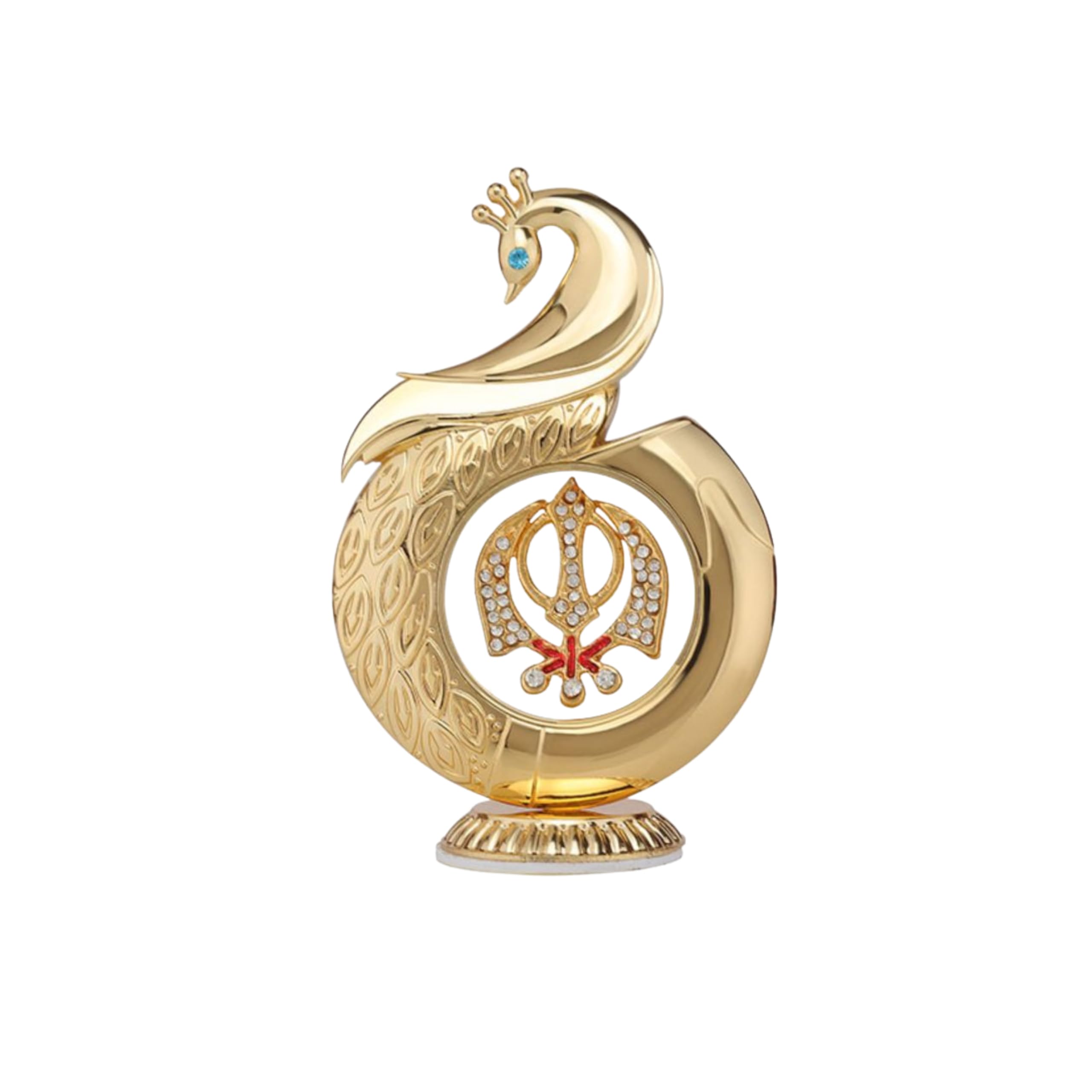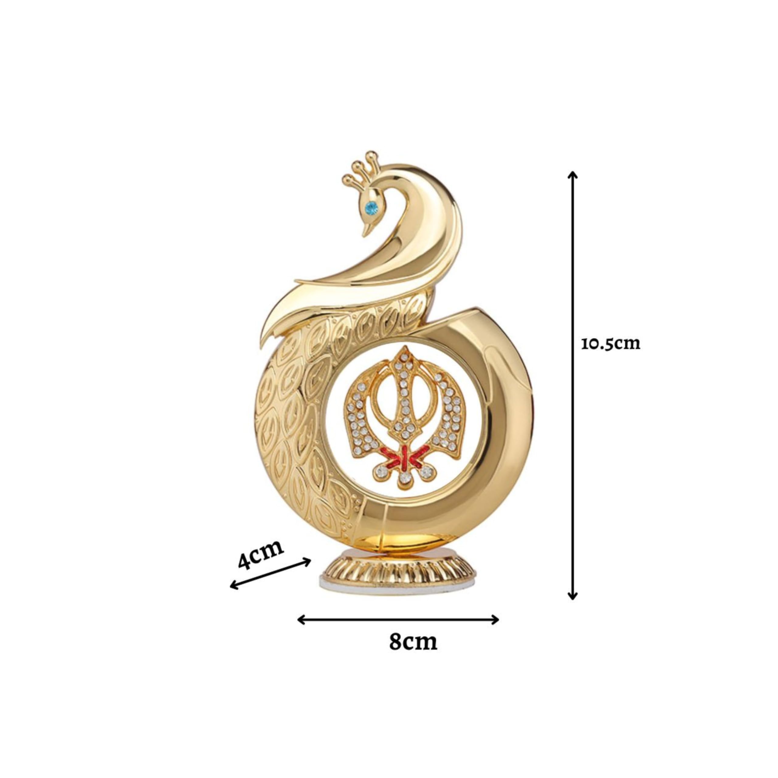 This Metal Peacock Khanda Car Dashboard Showpiece blends artistic elegance with spiritual meaning, featuring a gold-toned peacock frame around a crystal-studded Sikh Khanda symbol. Designed for dashboard use, it includes a strong adhesive base that keeps the piece secure even during movement. Its compact size, premium craftsmanship, and symbolic significance make it ideal for cars, prayer areas, offices, or home décor setups. It also serves as a thoughtful and meaningful gift for Sikh festivals and special occasions.
