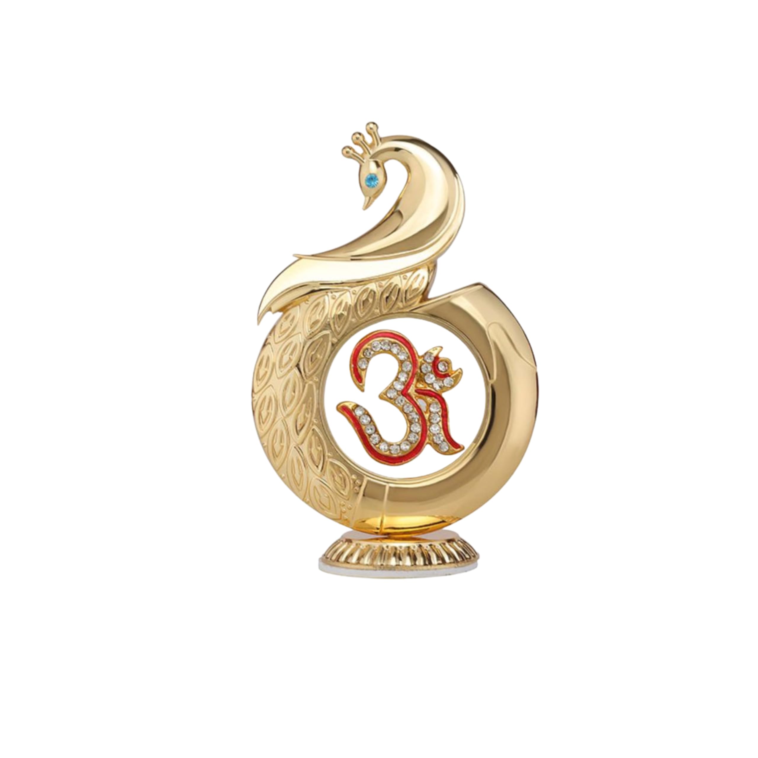 This Metal Peacock Om Car Dashboard Showpiece combines elegant craftsmanship with spiritual symbolism, featuring a gold-toned peacock frame surrounding a crystal-studded Om symbol. Designed for dashboard placement, the strong adhesive base ensures secure positioning even during bumpy drives. Its compact size, premium finish, and divine detailing make it perfect for cars, home décor, offices, or pooja spaces. With its blend of beauty and spirituality, this showpiece also makes a meaningful and thoughtful gift for festive and special occasions.