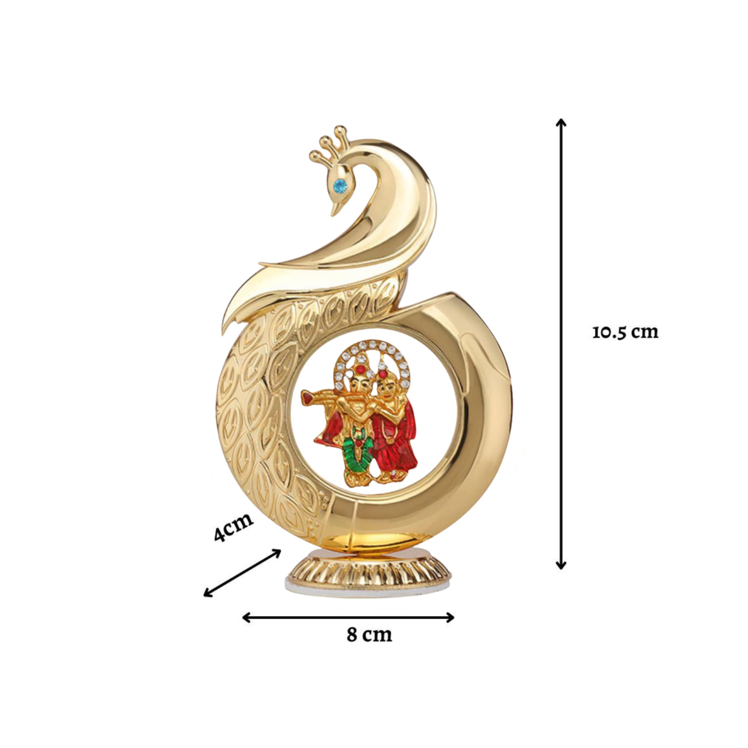 This Metal Peacock Radha Krishna Car Dashboard Showpiece is designed to bring divine charm and elegance to your car or living space. The gold-toned peacock frame surrounds a beautifully detailed Radha Krishna idol adorned with enamel colors and shimmering crystals. With its strong adhesive base, it sits securely on dashboards or flat surfaces in homes and offices. Compact, stylish, and devotional, it also makes a meaningful gift for loved ones on special occasions.