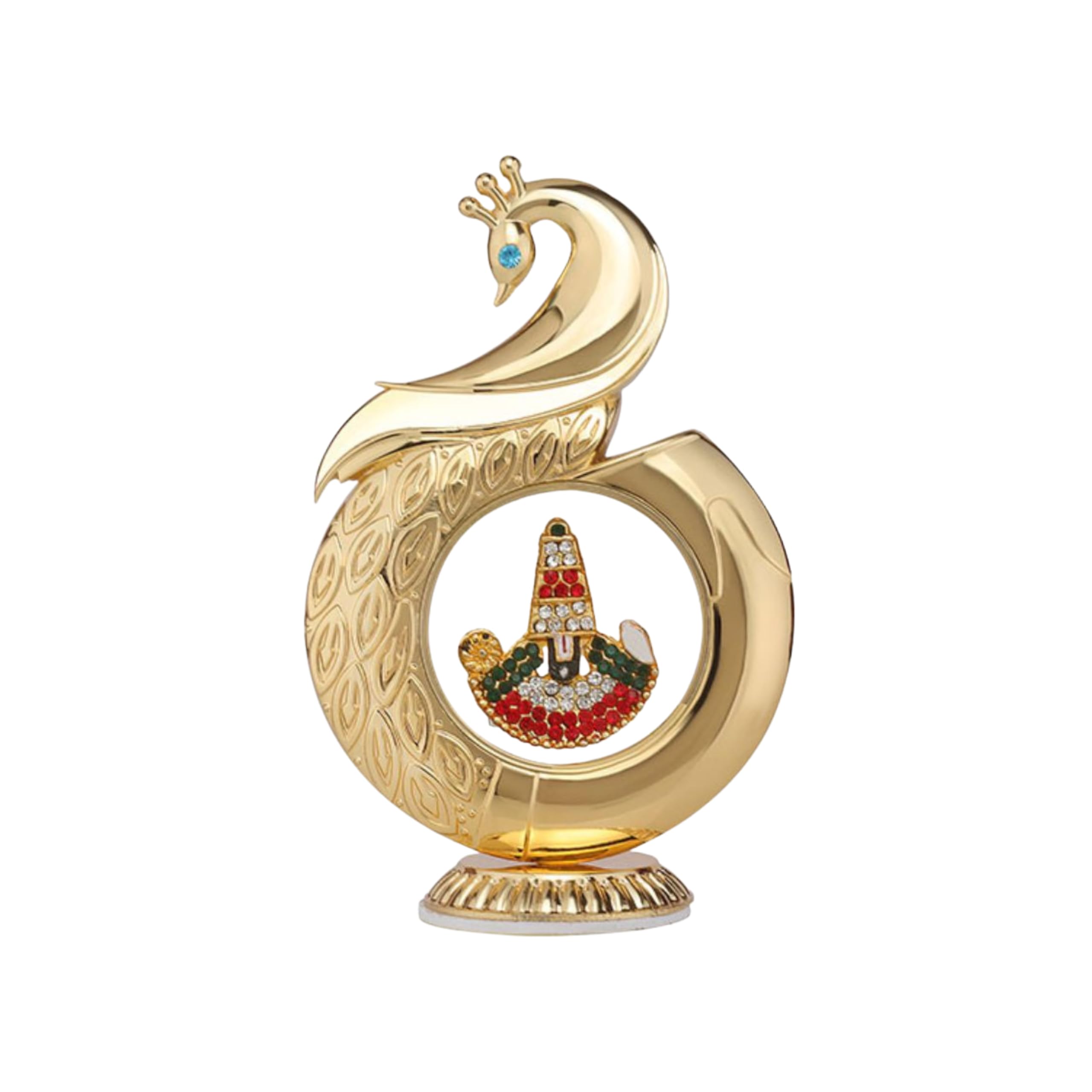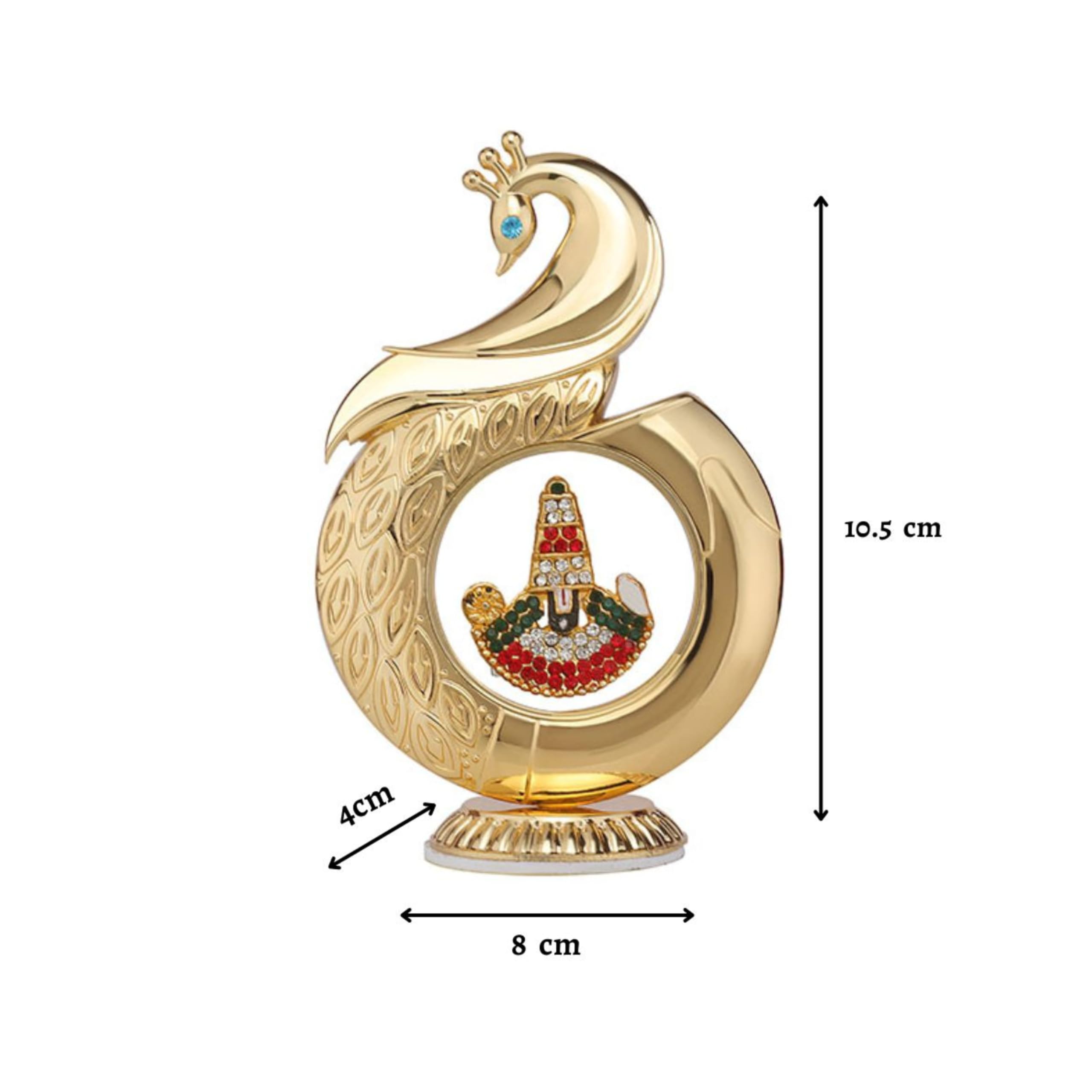 This elegant Metal Peacock Tirupati Balaji Car Dashboard Showpiece features a premium gold-plated finish with intricate feather detailing and a sparkling stone-studded Balaji idol at its centre. Designed specifically for car dashboards, it includes a strong adhesive base that ensures stable and safe placement even on bumpy drives. Its compact size and artistic form also make it suitable for use on home shelves, office desks, or spiritual corners. With its beautiful craftsmanship, spiritual symbolism, and premium quality, this showpiece is a perfect décor accessory as well as a thoughtful gift for devotional occasions.