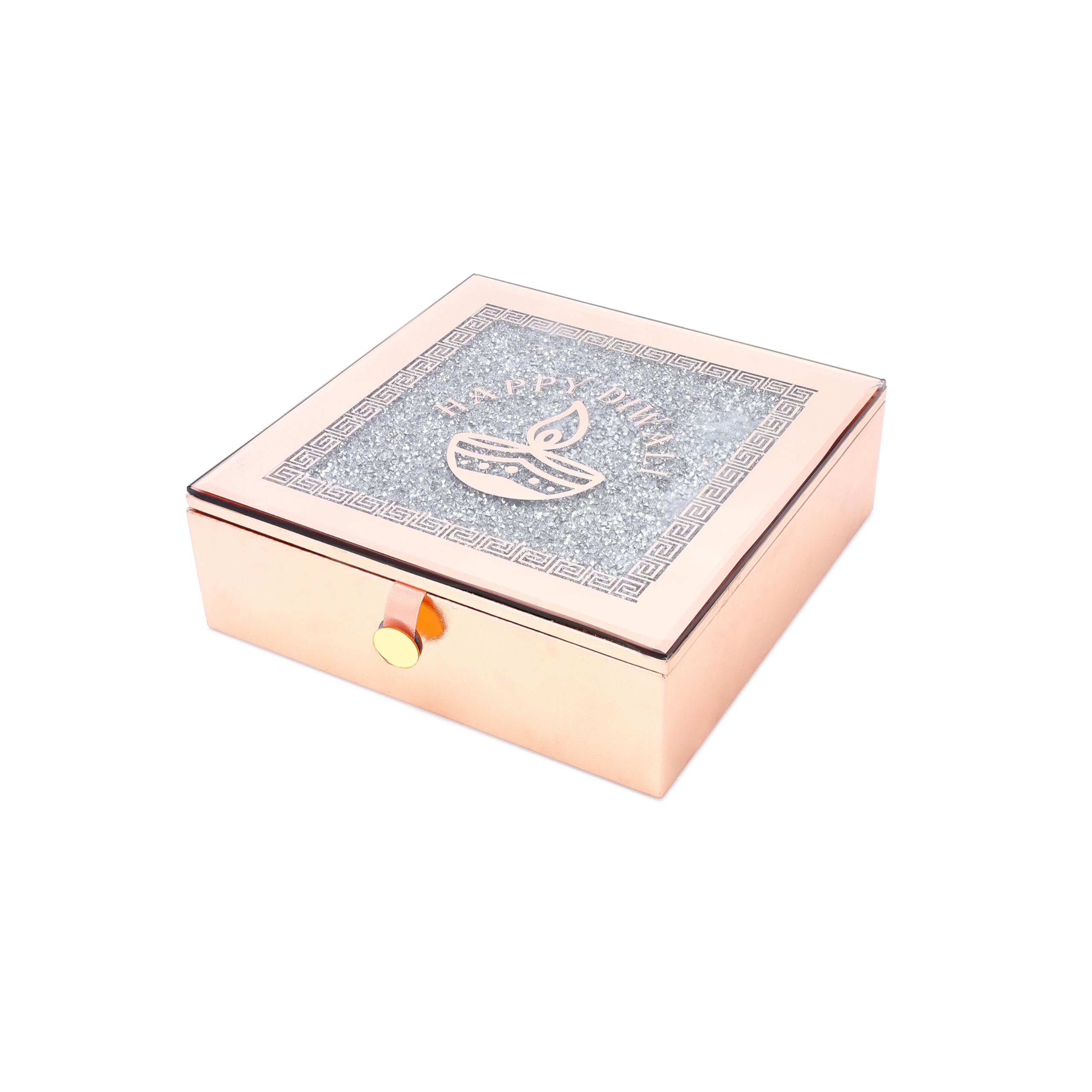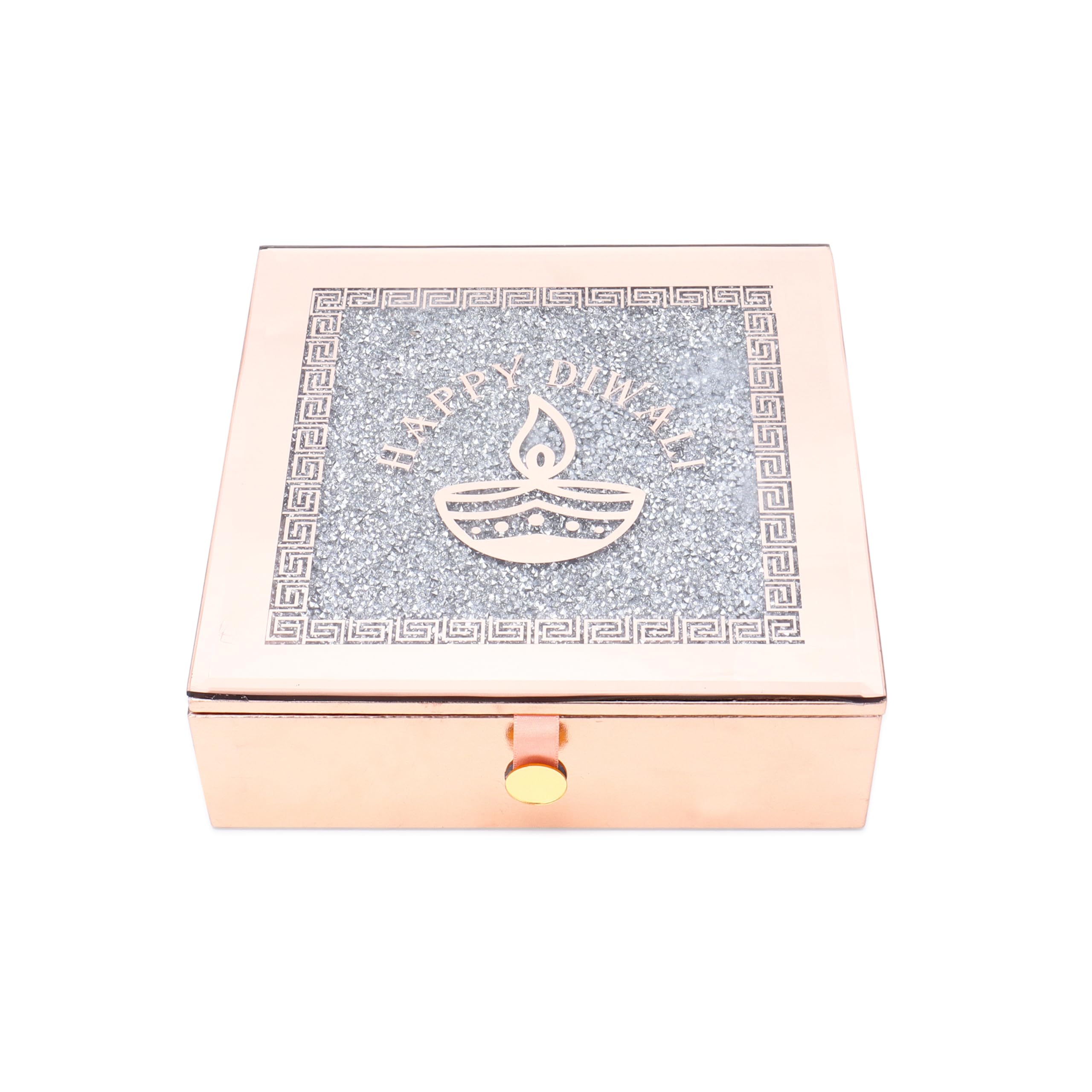 This Happy Diwali Gift Box is made with a sturdy MDF base and a glass top featuring a glitter design and “Happy Diwali” print, giving it a rich festive appeal. The elegant golden finish adds a premium touch, making it ideal for storing dry fruits, chocolates, sweets, or gifting during Diwali celebrations. Its durable build and sparkling look make it a perfect blend of style and utility for your festive collection.