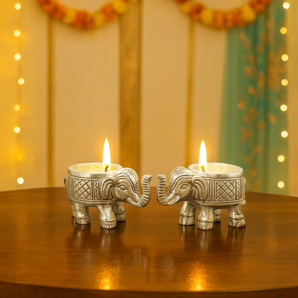 Silver Plated Elephant Design Metal Tealight Candle Holder Pair for home decor