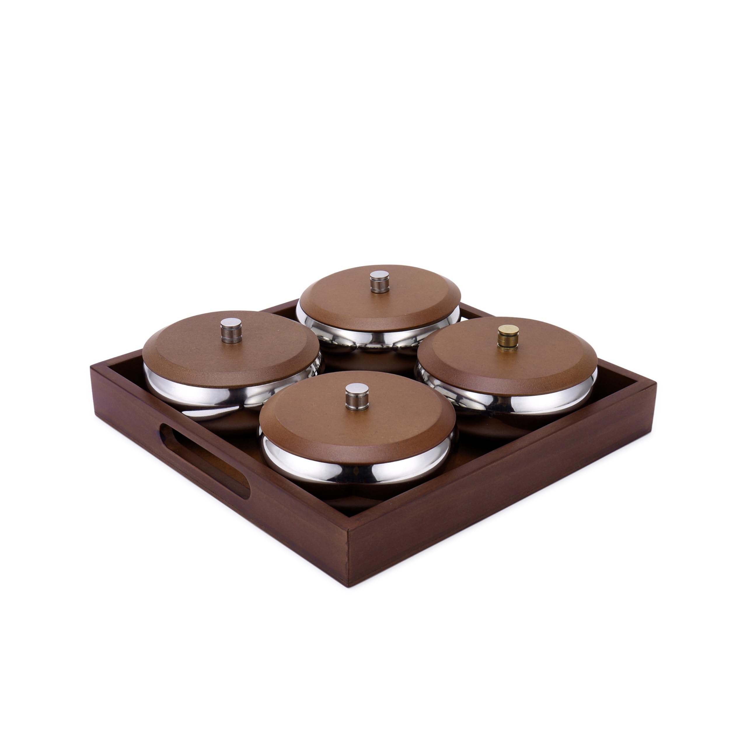 Wooden Tray with 4 Aluminium Bowls & Wooden Lids for Dry Fruits Serving